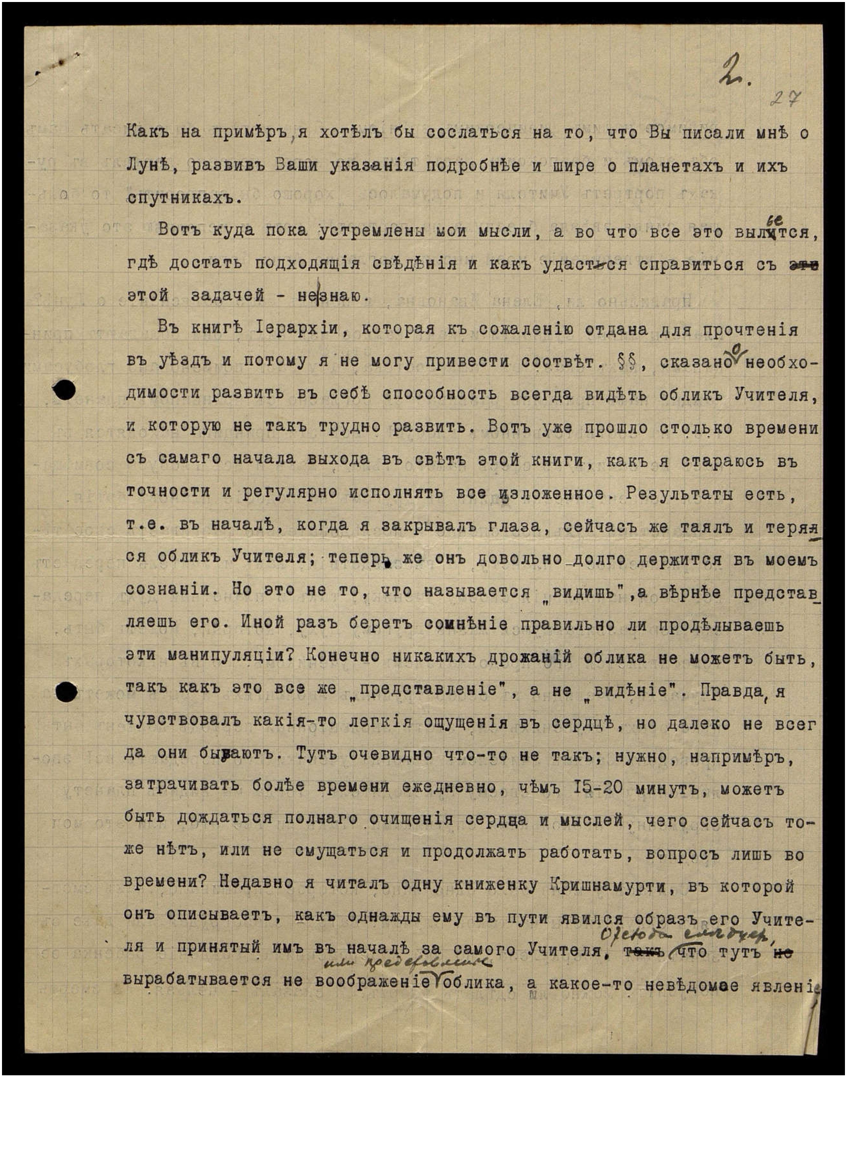 В книге Иерархии, которая, к сожалению, отдана для прочтения в уезде и потому я не могу привести соответствующие §§, сказано о необходимости развить в себе способность всегда видеть облик Учителя, и которую не так трудно развить. Вот уже прошло столько времени с самого начала выхода в свет этой книги, как я стараюсь в точности и регулярно исполнять все изложенное. Результаты есть, т.е. в начале, когда я закрывал глаза, сейчас же таял и терялся облик Учителя; теперь же он довольно долго держится в моём сознании. Но это не то, что называется "видишь", а вернее представляешь его. Иной раз берет сомнение правильно ли проделываешь эти манипуляции? Конечно, никаких дрожаний облика не может быть, так как это все же "представление", а не "видение". Правда, я чувствовал какие-то легкие ощущения в сердце, но далеко не всегда они бывают. Тут очевидно что-то не так; нужно, например, затрачивать более времени ежедневно, чем 15-20 минут, может быть дождаться полного очищения сердца и мыслей, чего сейчас тоже нет, или не смущаться и продолжать работать, вопрос лишь во времени? Недавно я читал одну книженку Кришнамурти, в которой он описывает, как однажды ему в пути явился образ его Учителя и принятый им в начале за самого Учителя. Отсюда следует, что тут вырабатывается не воображение или представление облика, а какое-то неведомое явление,