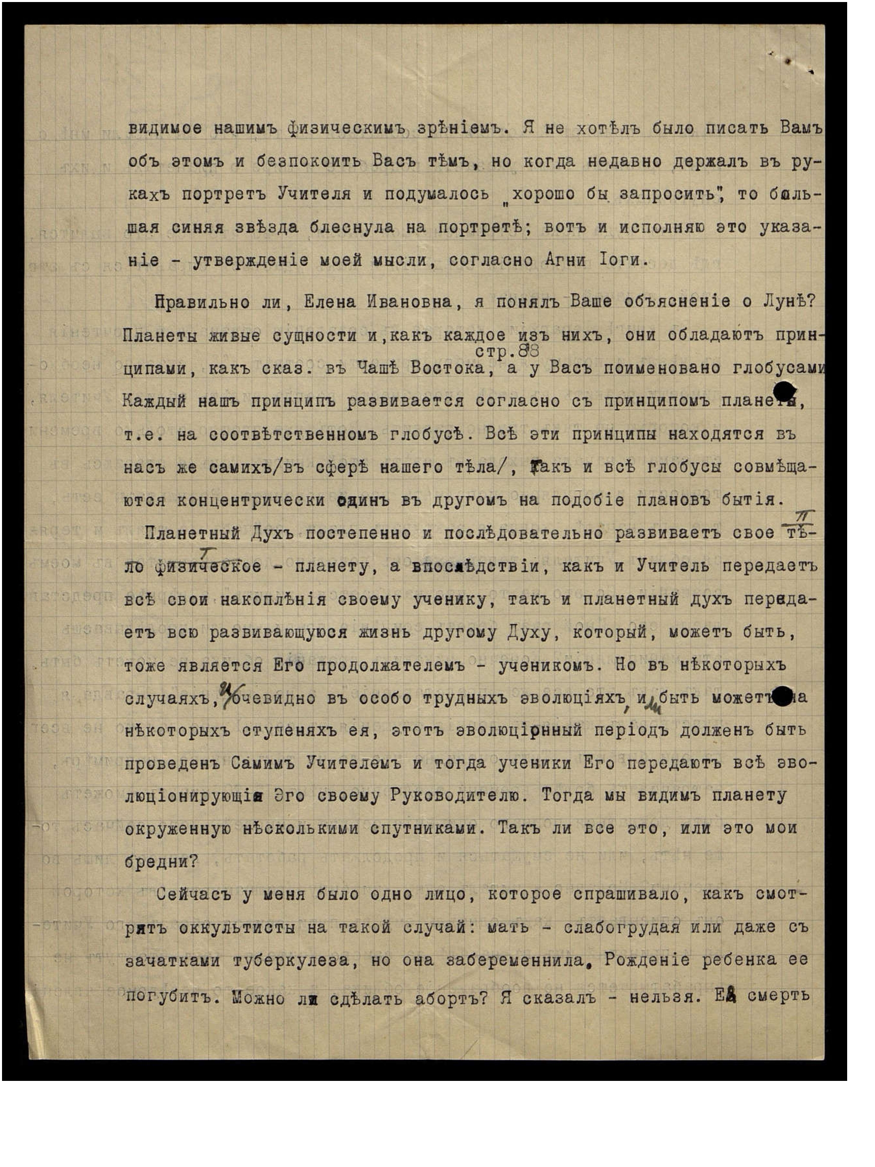 Правильно ли, Елена Ивановна, я понял Ваше объяснение о Луне? Планеты - живые сущности и как сказано в "Чаше Востока", стр. 88, а у Вас поименовано глобусами, каждый наш принцип развивается согласно с принципом планеты, т.е. на соответственном глобусе. Все эти принципы находятся в нас же самих (в сфере нашего тела), так и все глобусы совмещаются концентрически один в другом на подобие планов бытия.