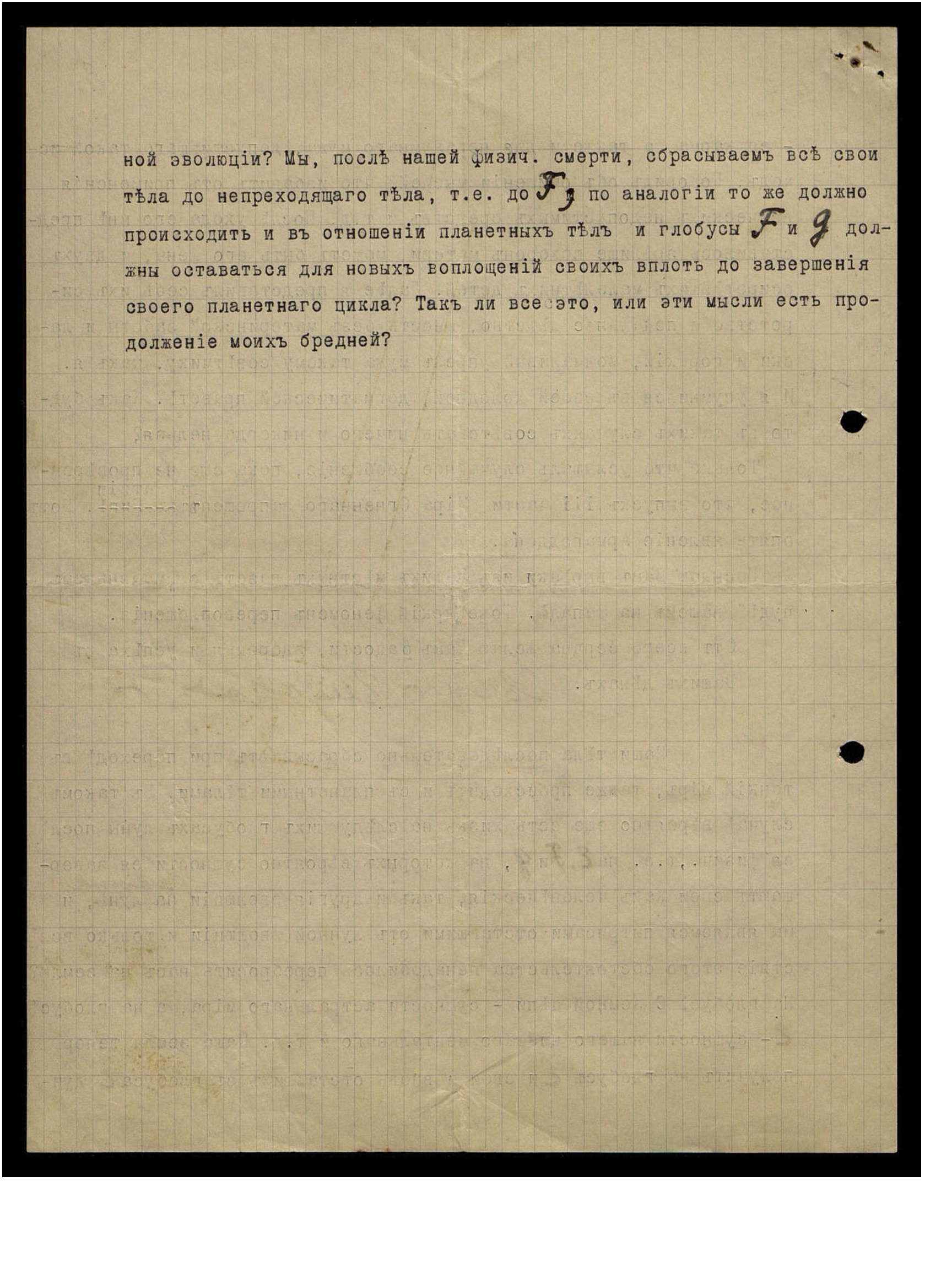 ной эволюции? Мы после нашей физической смерти сбрасываем все свои тела до непреходящего тела, т.е. до F, по аналогии то же должно происходить и в отношении планетных тел, и глобусы F и G должны оставаться для новых воплощений своих вплоть до завершения своего планетного цикла? Так ли все это, или эти мысли есть продолжение моих бредней?