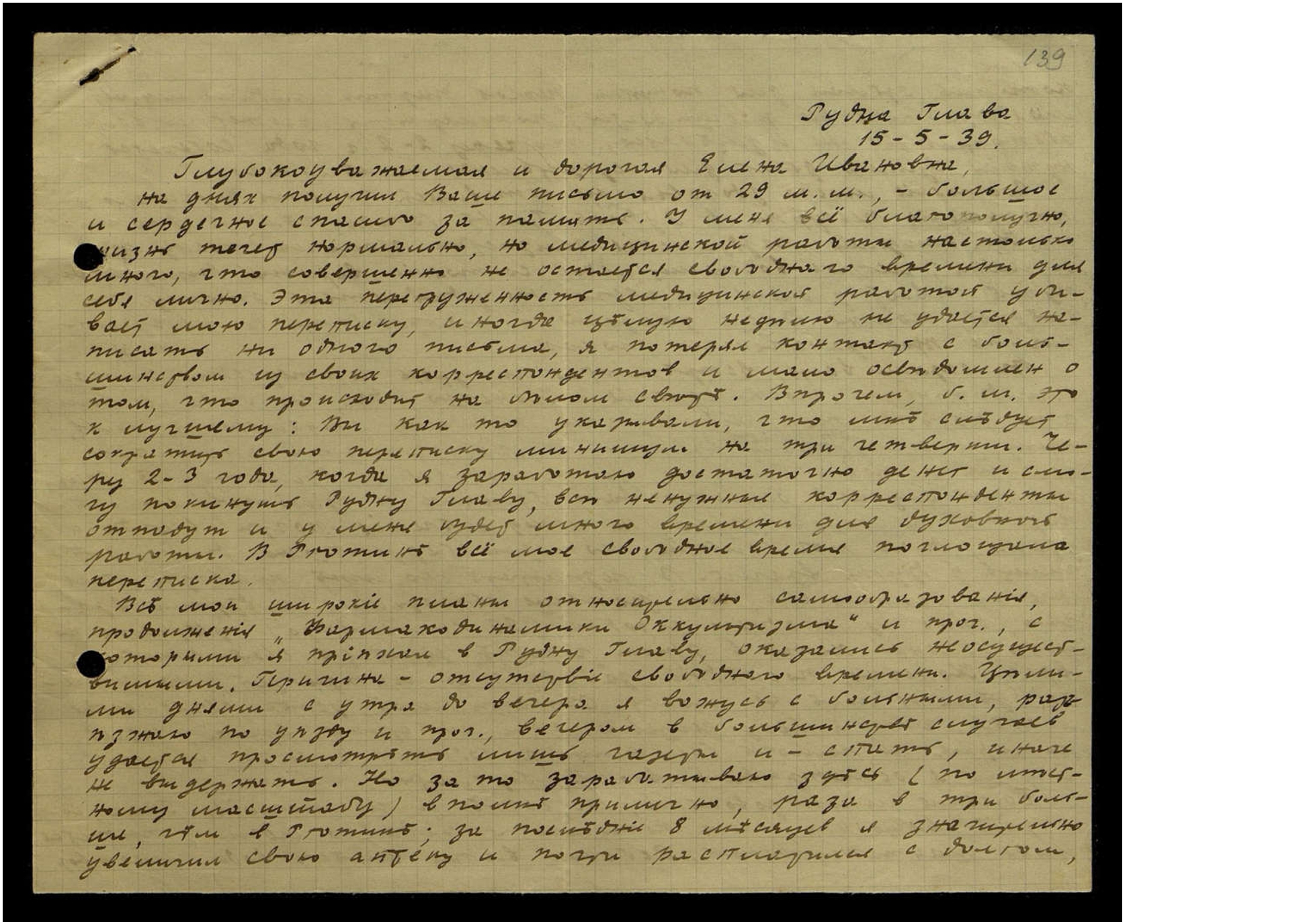 Глубокоуважаемая и дорогая Елена Ивановна, на днях получил Ваше письмо от 29 м. м., большое и сердечное спасибо за память. У меня всё благополучно, жизнь течёт нормально, но медицинской работы настолько много, что совершенно не остаётся свободного времени для себя лично. Эта перегруженность медицинской работы убивает мою переписку, иногда целую неделю не удаётся написать ни одного письма, я потерял контакт с большинством из своих корреспондентов и мало осведомлён о том, что происходит на белом свете. Впрочем, б[ыть] м[ожет] это к лучшему: Вы как-то указывали, что мне следует сократить свою переписку минимум на три четверти. Через 2-3 года, когда я заработаю достаточно денег и смогу покинуть Рудну Главу, все ненужные корреспонденты отпадут и у меня будет много времени для духовной работы. В Рготине всё моё свободное время поглощала переписка.