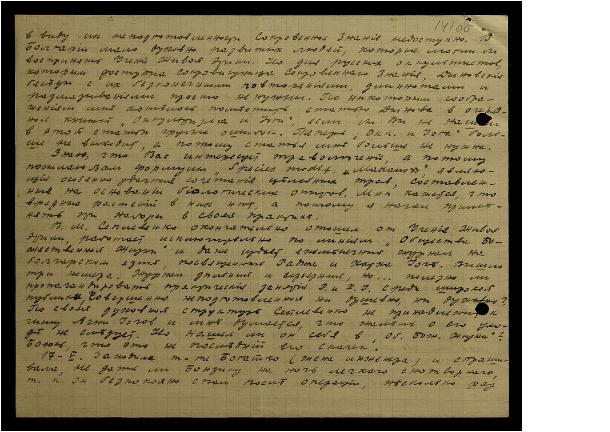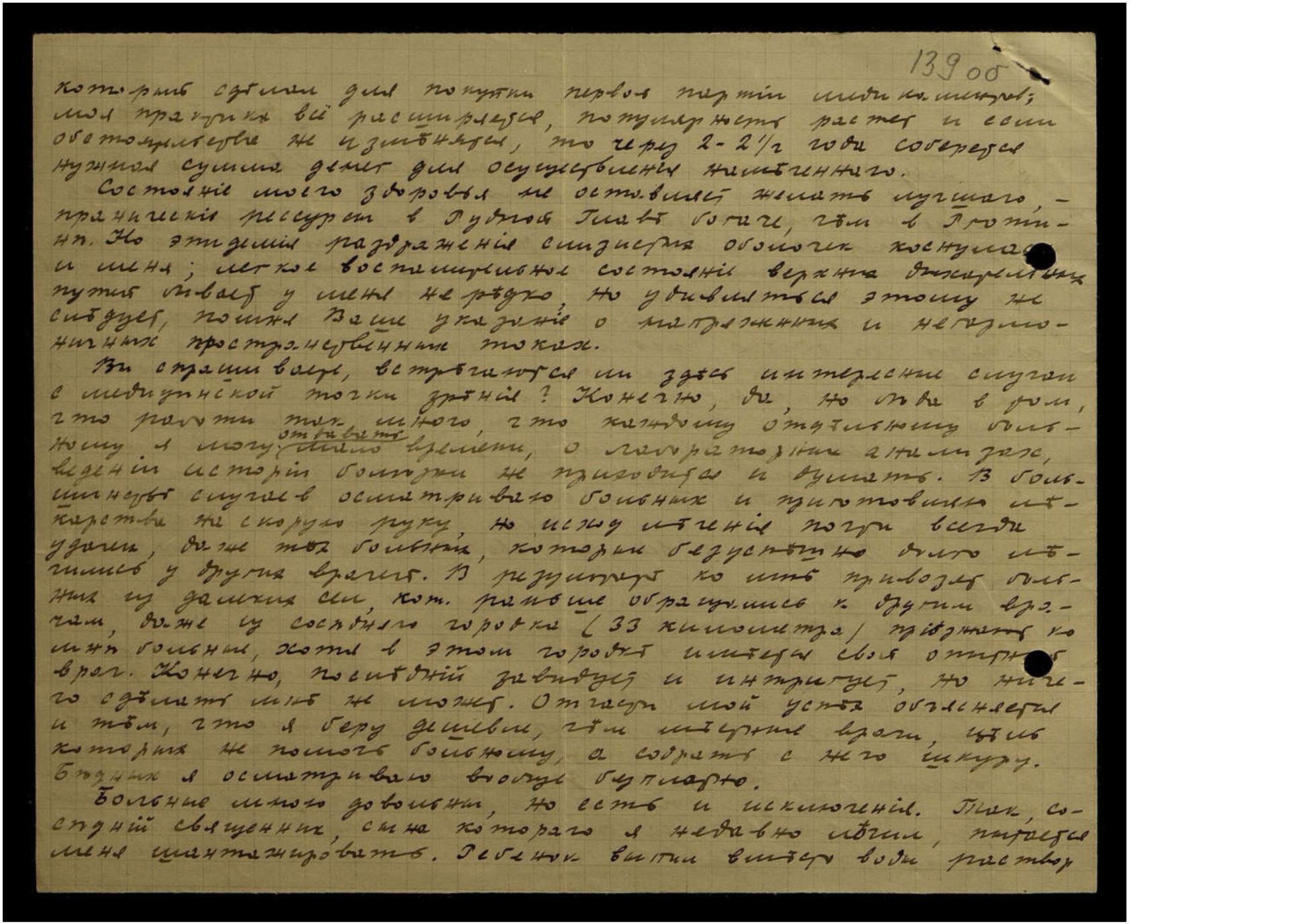 Вы спрашиваете, встречаются ли здесь интересные случаи с медицинской точки зрения? Конечно, да, но беда в том, что работы так много, что каждому отдельному больному я могу отдавать мало времени, о лабораторных анализах, ведении истории болезни не приходится думать. В большинстве случаев осматриваю больных и приготовляю лекарства на скорую руку, но исход лечения почти всегда удачен, даже те больные, которые безуспешно долго лечились у других врачей. В результате ко мне привозят больных из далёких сёл, кот[орые] раньше обращались к другим врачам, даже из соседнего городка (33 километра) приезжают ко мне больные, хотя в этом городке имеется свой опытный врач. Конечно, последний завидует и интригует, но ничего сделать мне не может. Отчасти мой успех объясняется и тем, что я беру дешевле, чем местные врачи, цель которых не помочь больному, а содрать с него шкуру. Бедных я осматриваю вообще бесплатно.