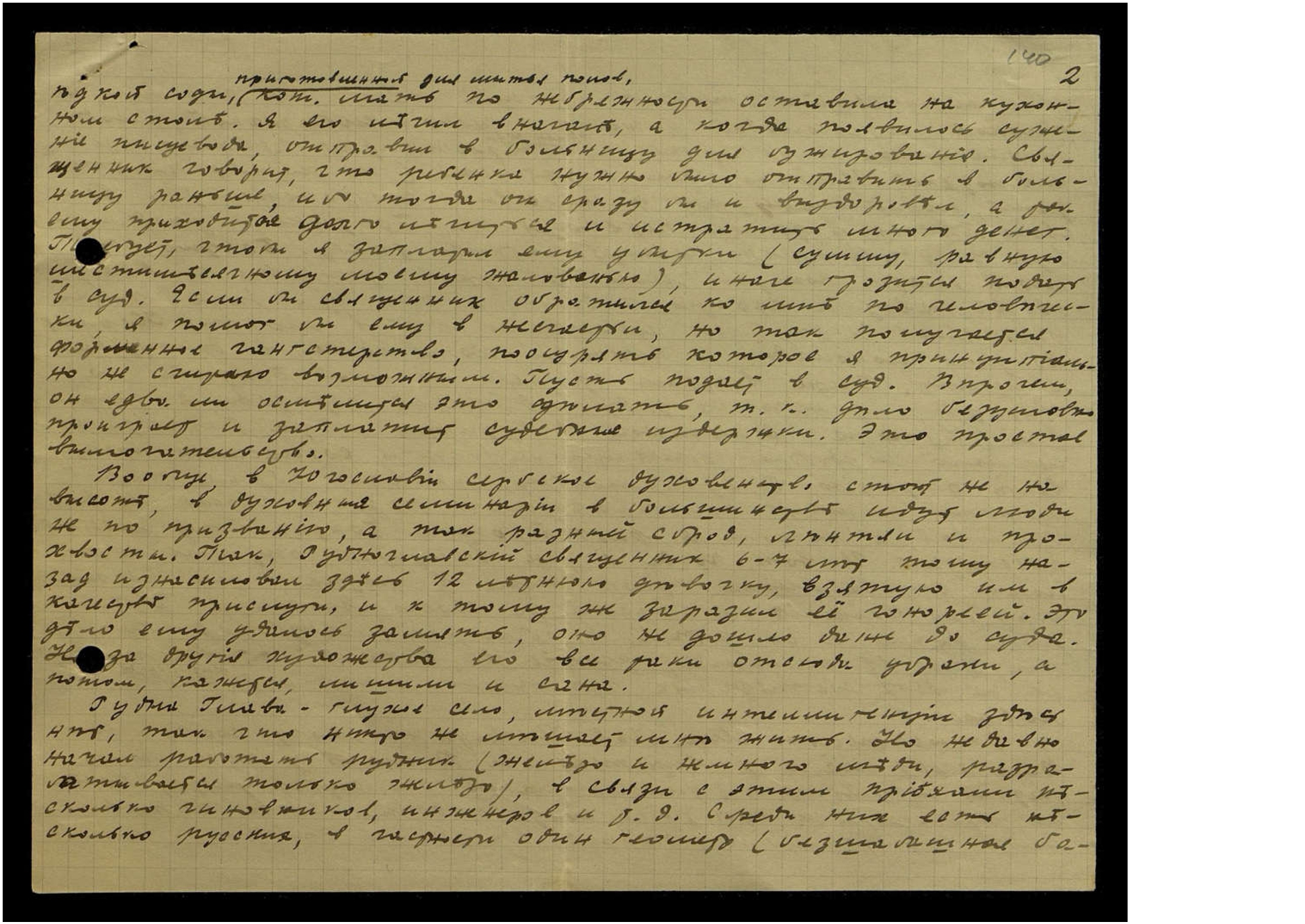 едкой соды, приготовленный для мытья полов, кот[орое] мать по небрежности оставила на кухонном столе. Я его лечил вначале, а когда появилось сужение пищевода, отправил в больницу для бужирования*. Священник говорит, что ребёнка нужно было отправить в больницу раньше, ибо тогда он сразу бы и выздоровел, а так ему приходится долго лечиться и истратить много денег. Требует, чтобы я заплатил ему убытки (сумму, равную шестимесячному моему жалованью), иначе грозит подать в суд. Если бы священник обратился ко мне по-человечески, я помог бы ему в несчастьи, но так получается форменное ганстерство, поощрять которое я принципиально не считаю возможным. Пусть подаёт в суд. Впрочем, он едва ли осмелится это сделать, т[ак] к[ак] дело безусловно проиграет и заплатит судебные издержки. Это простое вымогательство.
