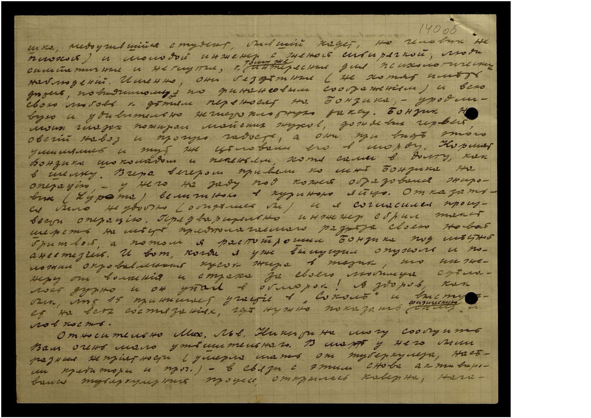 Относительно Мих[аила] Льв[овича] Никитина могу сообщить Вам очень мало утешительного. В марте у него были разные неприятности (умерла мать от туберкулёза, насели кредиторы и проч[ее]) в связи с этим снова активизировался туберкулёзный процесс, открылась каверна, нача-