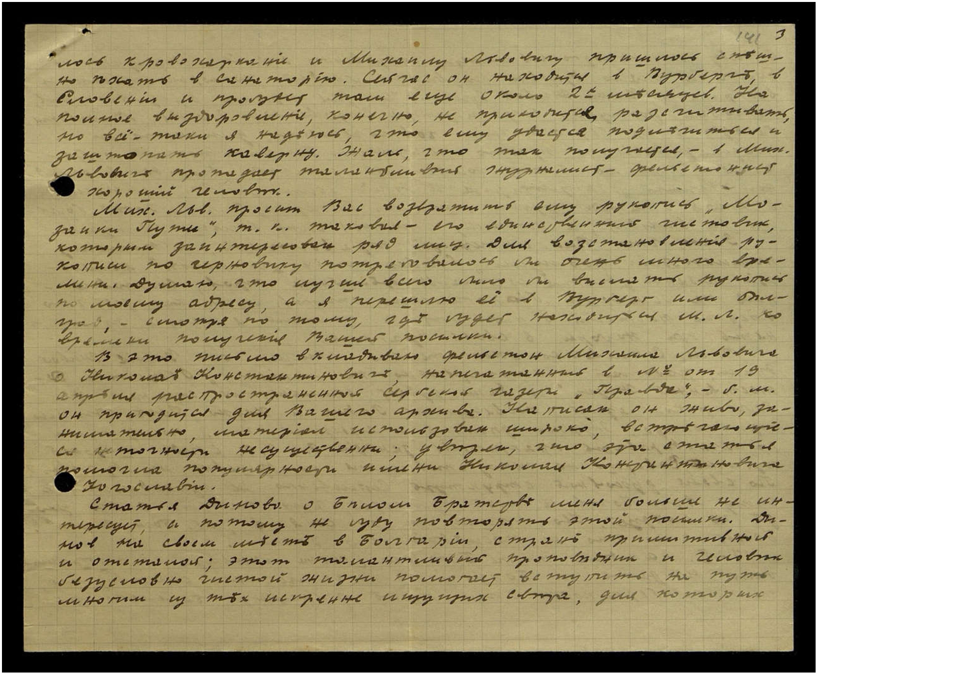 В это письмо вкладываю фельетон Михаила Львовича о Николае Константиновиче, напечатанный в № от 19 апреля распространённый сербской газеты "Правда", б[ыть] м[ожет], он пригодится для Вашего архива. Написан он живо, занимательно, материал использован широко, встречающиеся неточности несущественны; уверен, что эта статья помогла популярности имени Николая Константиновича в Югославии.