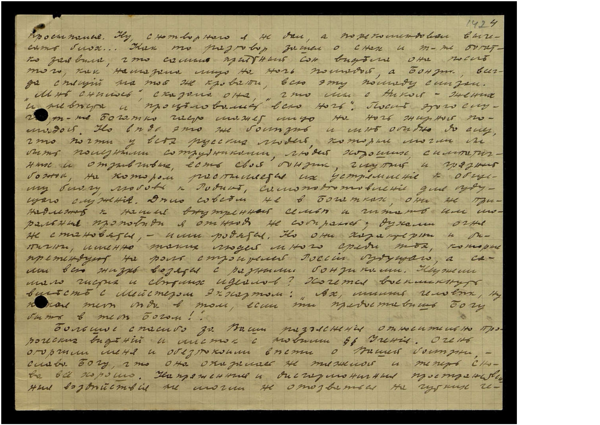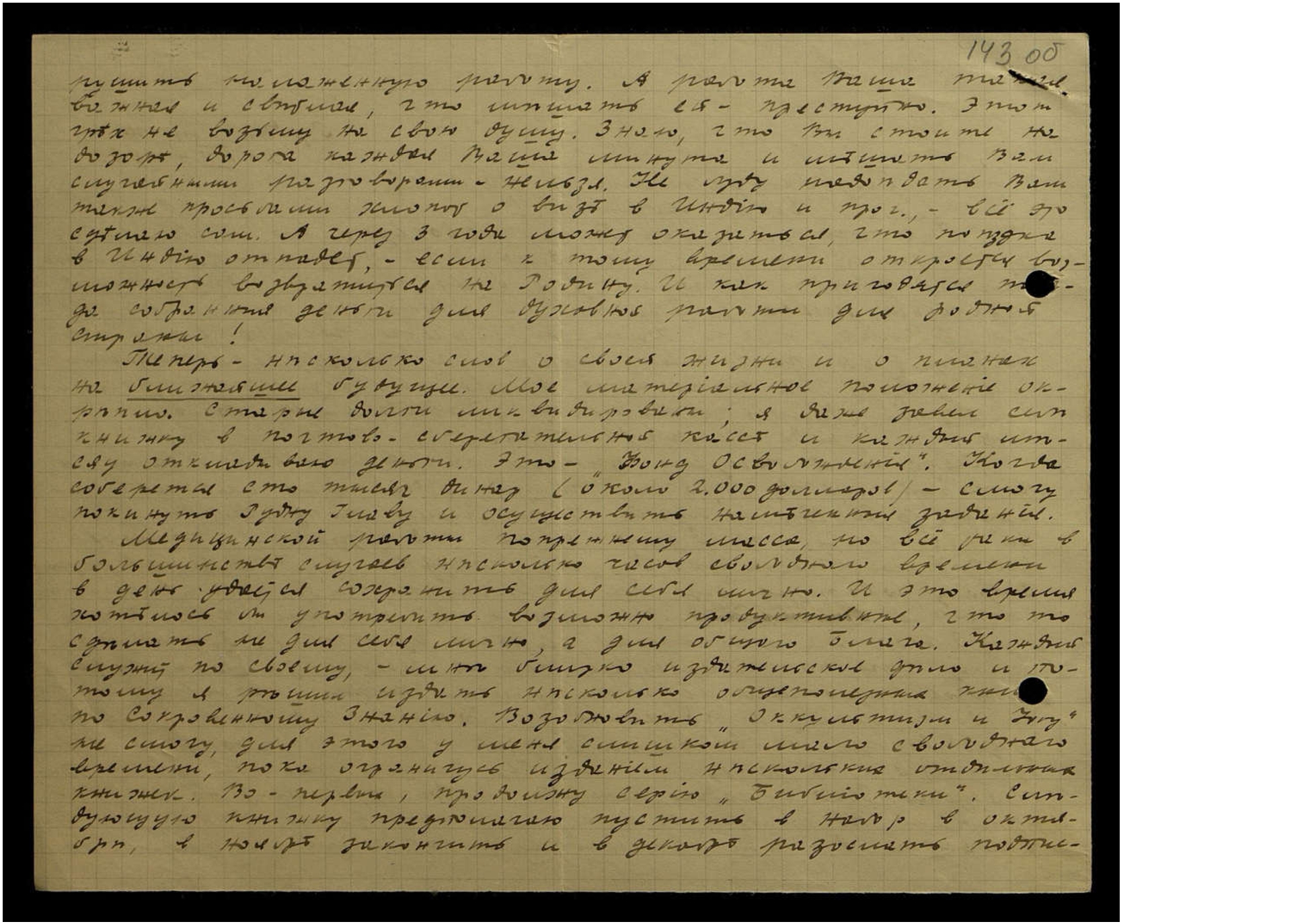 рушить налаженную работу. А работа Ваша такая важная и светлая, что мешать ей преступно. Этот грех не возьму на свою душу. Знаю, что Вы стоите на дозоре, дорога каждая Ваша минута и мешать Вам случайными разговорами нельзя. Не буду надоедать Вам также просьбами хлопот о визе в Индию и проч[ее], всё это сделаю сам. А через 3 года может оказаться, что поездка в Индию отпадёт, если к тому времени откроется возможность возвратиться на Родину. И как пригодятся тогда собранные деньги для духовной работы для родной страны!