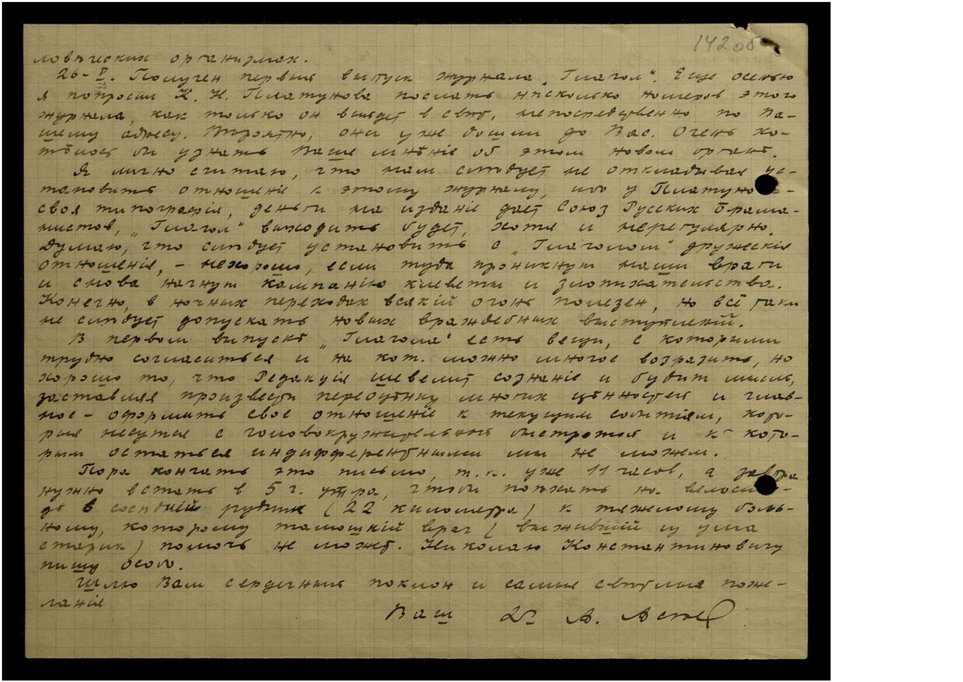 Я лично считаю, что нам следует, не откладывая, установить отношение к этому журналу, ибо у Платунова своя типография, деньги на издание даст Союз Русских Браманистов, "Глагол" выходить будет, хотя и нерегулярно. Думаю, что следует установить с "Глаголом" дружеские отношения — нехорошо, если туда проникнут наши враги и снова начнут компанию клеветы и злопыхательства. Конечно, в ночных переходах всякий огонь полезен, но всё-таки не следует допускать новых враждебных выступлений.