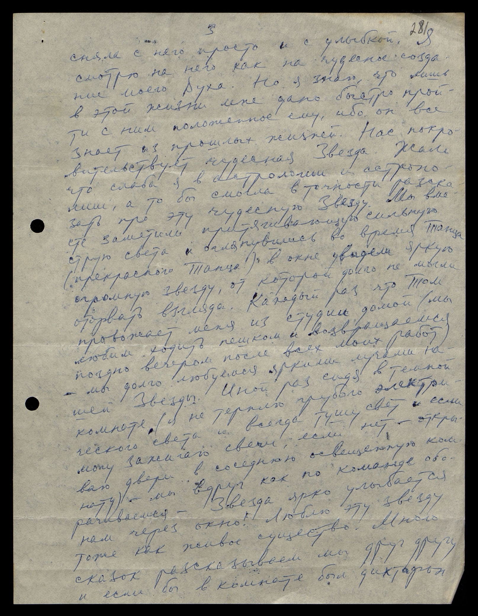 На днях, родная, странный случай, который я не записала, но решила сообщить Вам. Мы с Томом сидели после работы в полутёмной комнате и любовались нашей Звездой. Вдруг кто–то явственно постучал в дверь. Том улыбнулся: «How polite — usually they all ust intrude whenever they please [англ.: «Как вежливо — обычно они все вторгаются, когда им заблагорассудится]", — и пошёл открыть дверь. Никого не было у двери, и когда он пошёл проверить, во всём здании свет был потушен и дверь на улицу тоже закрыта на замок. Я вдруг почувствовала странное тоскливое стеснение в сердце… и мы живо прибрали нашу студию и ушли. Как только