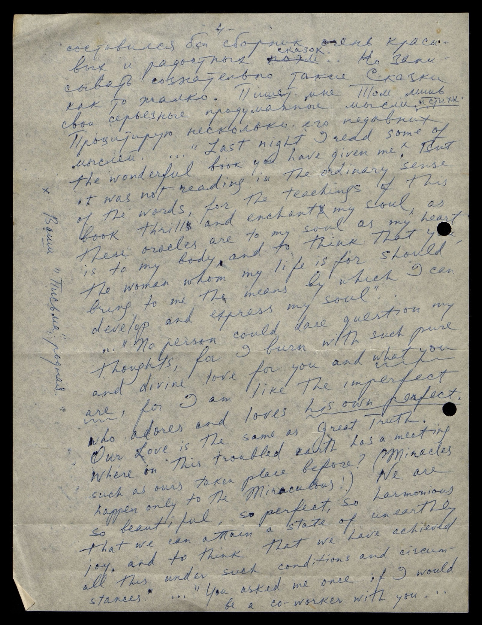 … «Ни один человек не мог бы осмелиться подвергнуть сомнению мои мысли, ибо я горю такой чистой и божественной любовью к тебе и к тому, кто ты есть, ибо я подобен несовершенному, который обожает и любит своё собственное совершенство. Наша любовь — то же самое, что великая Истина. Где в этой беспокойной стране раньше происходила встреча, подобная нашей? (Чудеса случаются только с Чудотворными!) Мы так прекрасны, так совершенны, так гармоничны, что можем достичь состояния неземной Радости, и подумать, что всего этого мы достигли при таких условиях и обстоятельствах»... "Однажды ты спросила меня, хотел бы я быть твоим сотрудником…"]