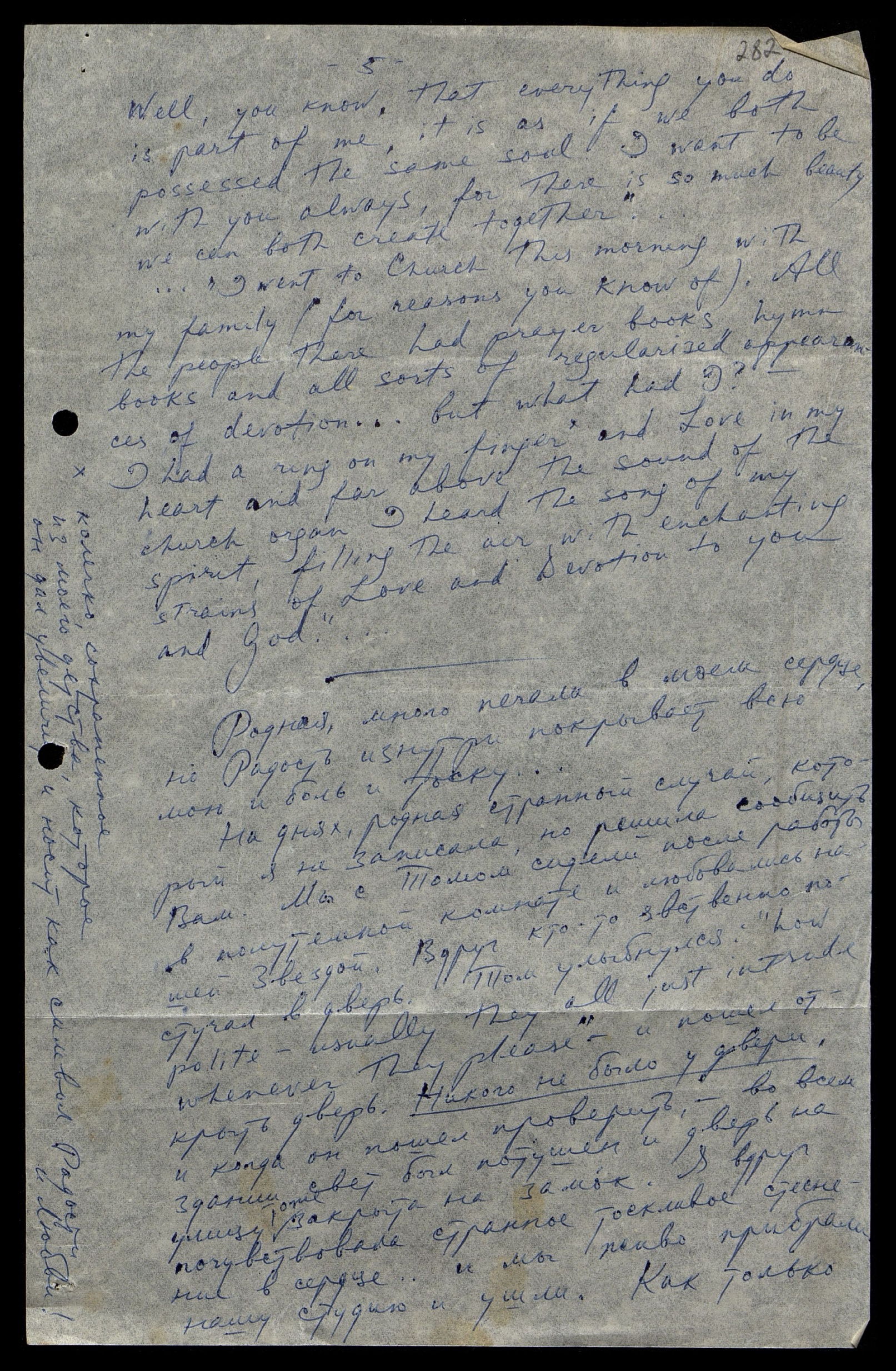 … «I went to Church this morning with my family (for reasons you know of). All the people there had prayer books, hymn books and all sorts of regularized appearance's of devotion… but what had I? — I had a ring on my finger* and love in my heart and for above the sound of the church organ I heard the song of my spirit, filling the air with enchanting strains of love and Devotion to you and God».