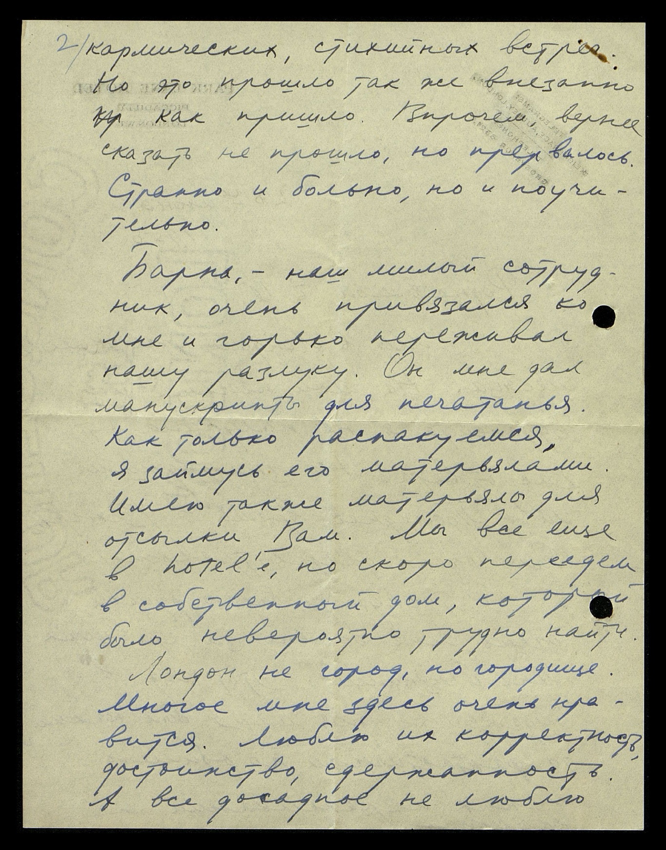 Барна, наш милый сотрудник, очень привязался ко мне и горько переживал нашу разлуку. Он мне дал манускрипты для печатанья. Как только распакуемся, я займусь его материалами. Имею также материалы для отсылки Вам. Мы всё ещё в hotel'e, но вскоре переедем в собственный дом, который было невероятно трудно найти. Лондон — не город, но городище. Многое мне здесь очень нравится. Люблю их корректность, достоинство, сдержанность. А всё досадное не люблю,