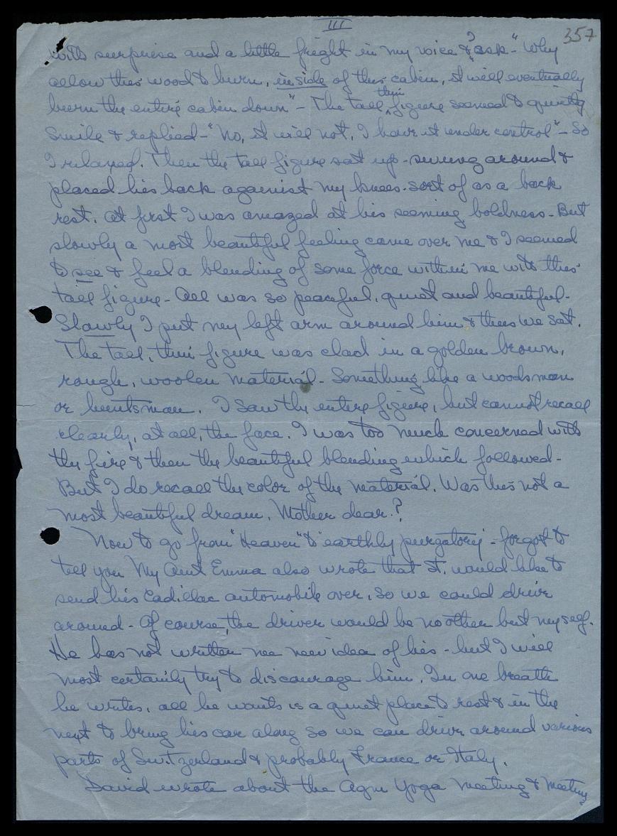 [англ.: С удивлением и лёгким испугом в голосе я спросила: “Зачем позволять этому дереву гореть внутри хижины? В конце концов, вся хижина сгорит дотла”. Высокая худая фигура, казалось, тихо улыбнулась и ответила: “Нет, этого не произойдёт. У меня всё под контролем”. Так что я расслабилась. Затем высокая фигура села, развернулась и прислонилась спиной к моим коленям, как бы подпирая их. Сначала я была поражена его кажущейся смелостью, но постепенно меня охватило самое прекрасное чувство, и я, казалось, увидела и почувствовала, как какая-то сила сливается во мне с этой высокой фигурой. Всё было так мирно, умиротворяюще и прекрасно. Я медленно обняла его левой рукой, и мы сели. Высокая, худощавая фигура была одета в золотисто-коричневую грубую шерстяную одежду. Что-то вроде лесничего или охотника. Я видела всю фигуру целиком, но не могу отчетливо вспомнить лицо. Я была слишком увлечена огнём, а после тем, как красиво всё смешалось. Но я помню цвет материала. Разве это был не самый прекрасный сон, дорогая Мама?