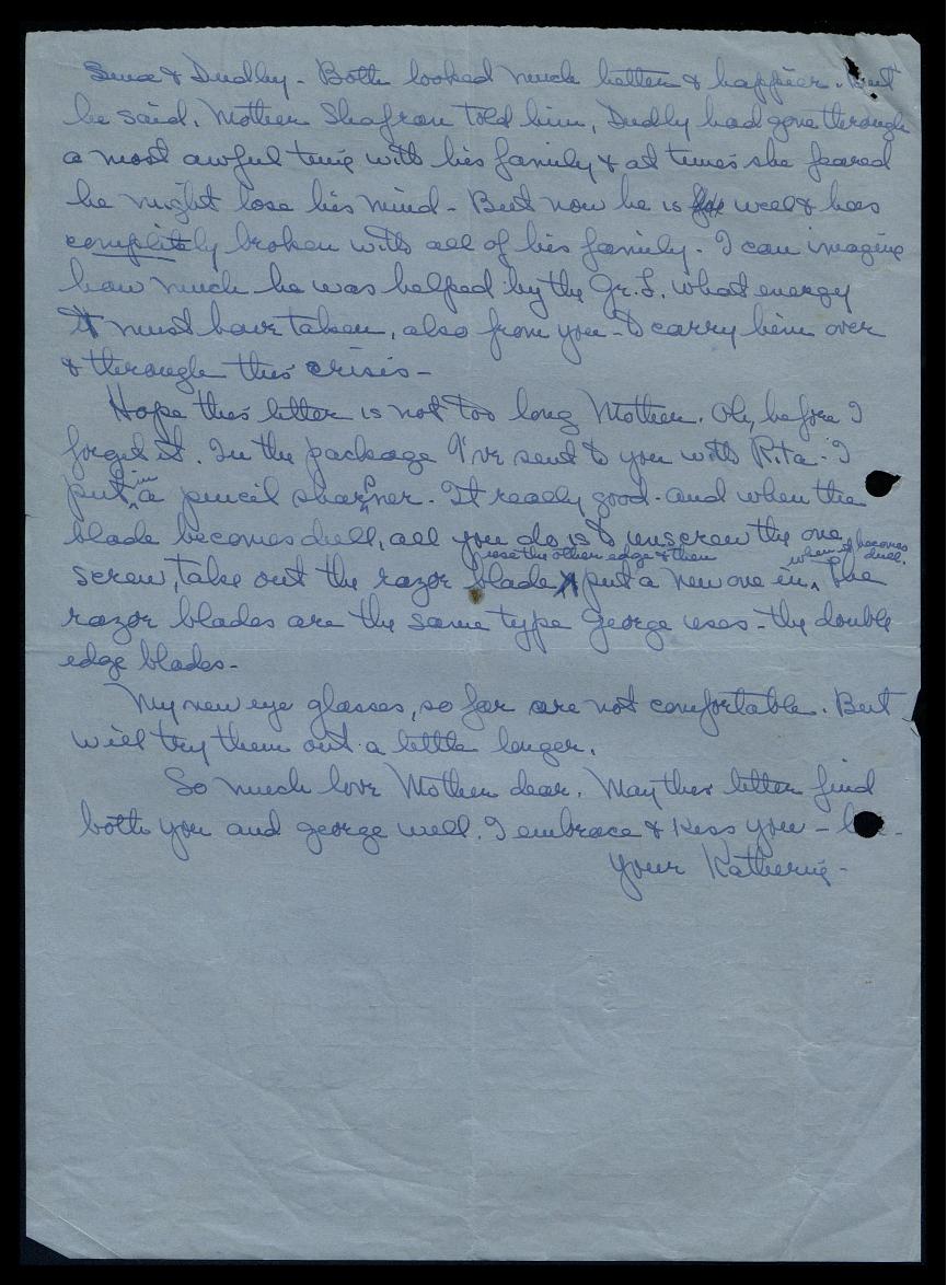 Hope this letter is not too long Mother. Oh, before I forget it, in the package I sent to you with Rita, I put in a pencil sharpener. It really is good and when the blade becomes dull, all you do is to unscrew the one screw, take out the razor blade, use the other edge, and then put a new one in when it becomes dull. The razor blades are the same type George uses—the double-edged blades.