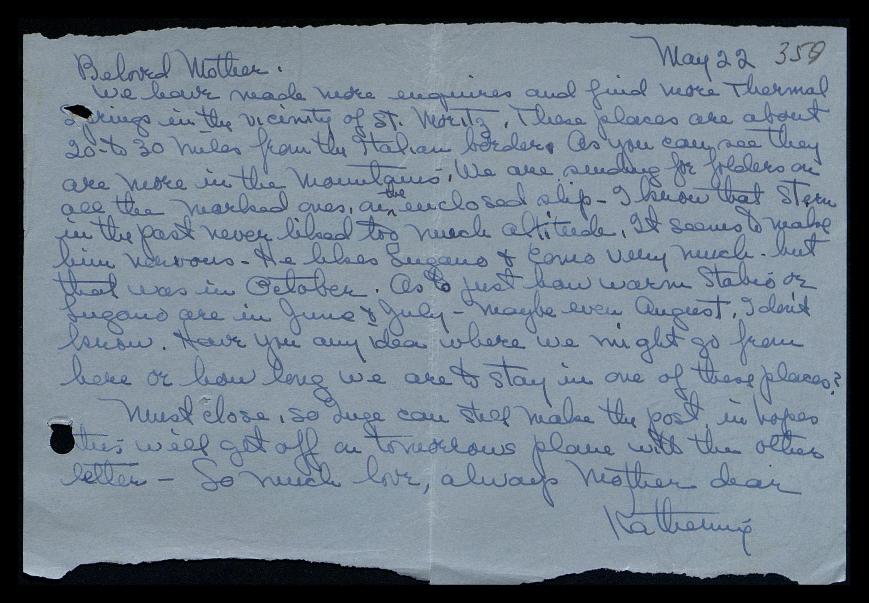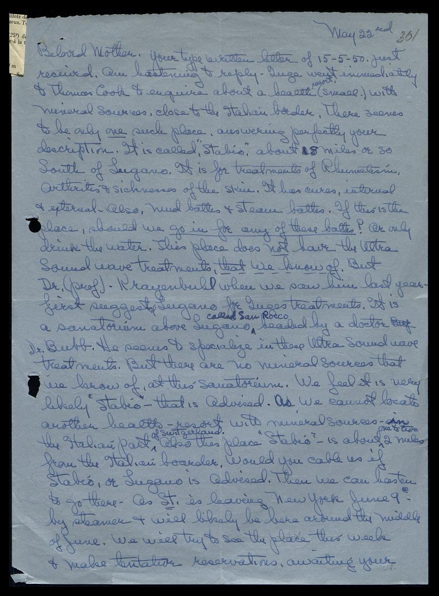 Inge went immediately to Thomas Cook to inquire about a health resort (small) with mineral sources close to the Italian border. There seems to be only one such place answering perfectly your description. It is called “Stabio” about eighteen miles or so south of Lugano [Switzerland]. It is for treatments of rheumatism, arthritis, and sickness of the skin. It has cures internally and externally, [and] also mud baths and steam baths. If this is the place, should we go in for any of these baths, or only drink the water? This place does not have the ultrasound wave treatments that we know of. But Dr. (Prof) Krayenbuhl, when we saw him last year, first suggested Lugano for Inge’s treatments. It is a sanatorium above Lugano called San Rocco headed by a doctor named Dr. Bubb. He seems to specialize in these ultrasound wave treatments. But there are no mineral sources that we know of at this sanatorium. We feel it is very likely “Stabio” that is advised. We cannot locate another health resort with mineral sources in the Italian part of Switzerland. Also, this place “Stabio” is about one to two miles from the Italian border. Would you cable us if Stabio or Lugano is advised? Then we can hasten to go there, as St[ern] is leaving New York, on June 9th by steamer and will likely be here around the middle of June. We will try to see the place this week and make tentative reservations; awaiting your