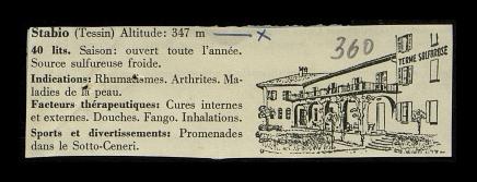cable to make the reservations different. It being such a small place, it might be booked for the summer, but we will try. Would you then write us and let us know about the baths and whether Inge should continue with the ultrasound treatments in Lugano or only rest and drink the waters in “Stabio”? You mention that at this new resort, the new physician will give Inge treatments of a new ray. So maybe at this place “Stabio” there is some new machine that is not mentioned in the prospectus, thus, eliminating Lugano sound wave treatments. But this we can only ascertain when we see “Stabio.” Stabio is nearer to Como in Italy than to Lugano. I should say about ten miles from Lake Como and 18 miles from Lugano.