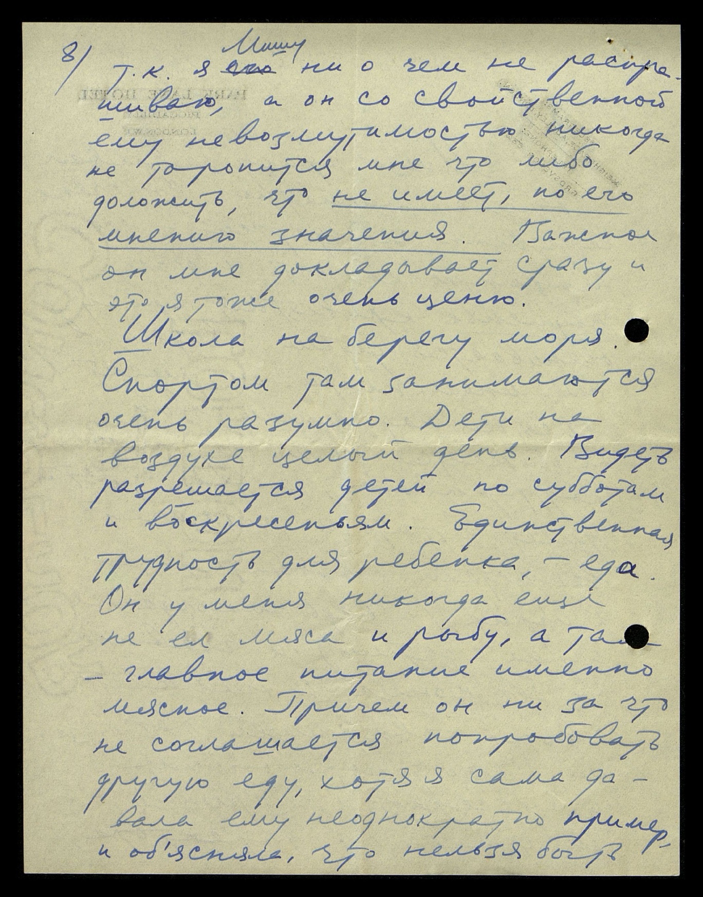 Школа на берегу моря. Спортом там занимаются очень разумно. Дети на воздухе целый день. Видеть разрешается детей по субботам и воскресеньям. Единственная трудность для ребенка — еда. Он у меня никогда ещё не ел мяса и рыбу, а там — главное питание именно мясное. Причём он ни за что не соглашается попробовать другую еду, хотя я сама давала ему неоднократно пример и объясняла, что нельзя быть