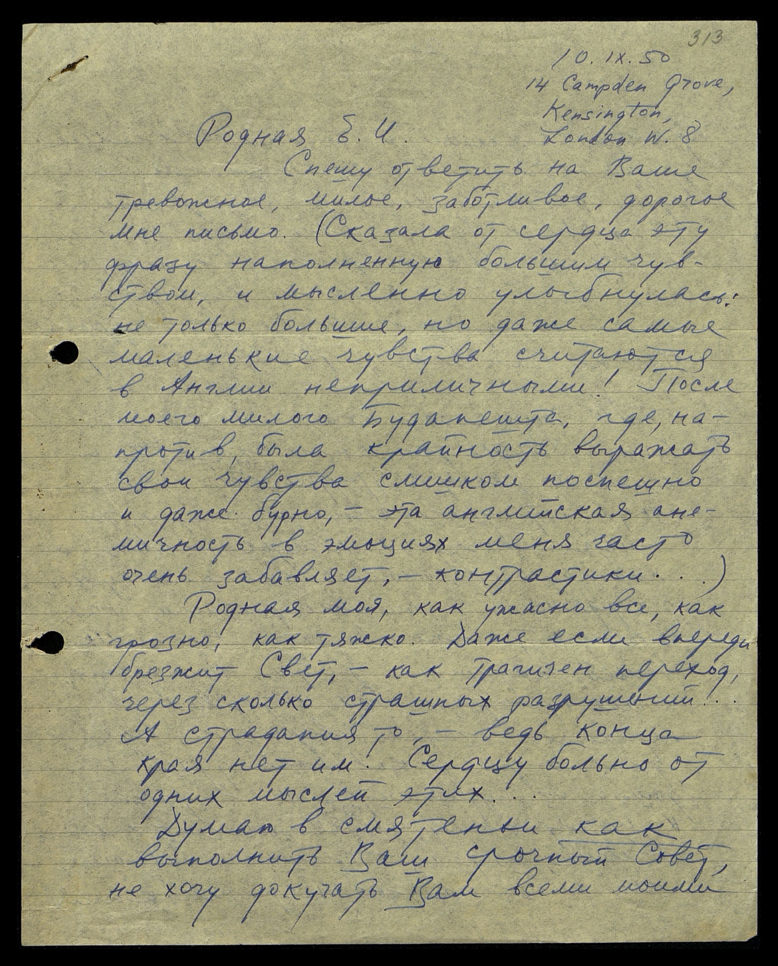 Спешу ответить на Ваше тревожное, милое, заботливое, дорогое мне письмо. (Сказала от сердца эту фразу, наполненную большим чувством, и мысленно улыбнулась: не только большие, но даже самые маленькие чувства считаются в Англии неприличными! После моего милого Будапешта, где, напротив, была крайность выражать свои чувства слишком поспешно и даже бурно, эта английская анемичность в эмоциях меня часто очень забавляет, — контрастики...)