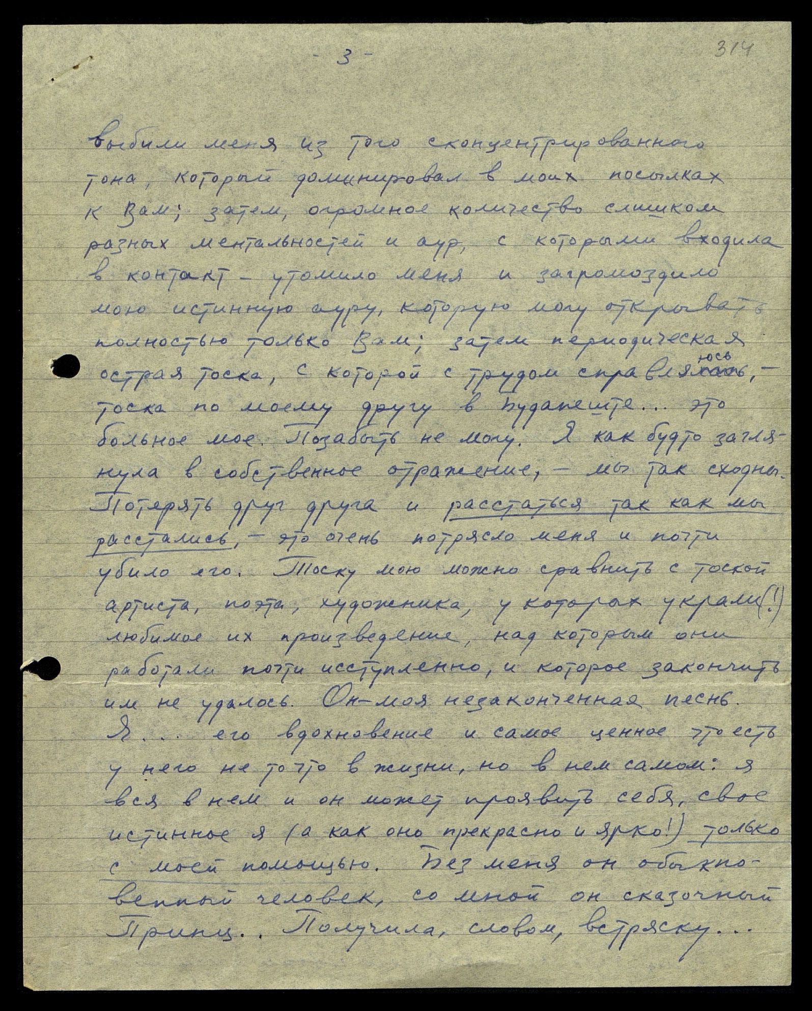 выбили меня из того сконцентрированного тона, который доминировал в моих посылках к Вам; затем огромное количество слишком разных ментальностей и аур, с которыми входила в контакт — утомило меня и загромоздило мою истинную ауру, которую могу открывать полностью только Вам; затем периодическая острая тоска, с которой с трудом справляюсь — тоска по моему другу в Будапеште... Это больное моё. Позабыть не могу. Я как будто заглянула в собственное отражение — мы так сходны. Потерять друг друга и расстаться так, как мы расстались — это очень потрясло меня и почти убило его. Тоску мою можно сравнить с тоской артиста, поэта, художника, у которых украли (!) любимое их произведение, над которым они работали почти исступлённо и которое закончить им не удалось. Он — моя незаконченная песнь. Я... — его вдохновение и самое ценное, что есть у него не то что в жизни, но в нём самом: я вся в нём и он может проявить себя, своё истинное я (а как оно прекрасно и ярко!) только с моей помощью. Без меня он — обыкновенный человек, со мной он — сказочный Принц. Получила, словом, встряску...