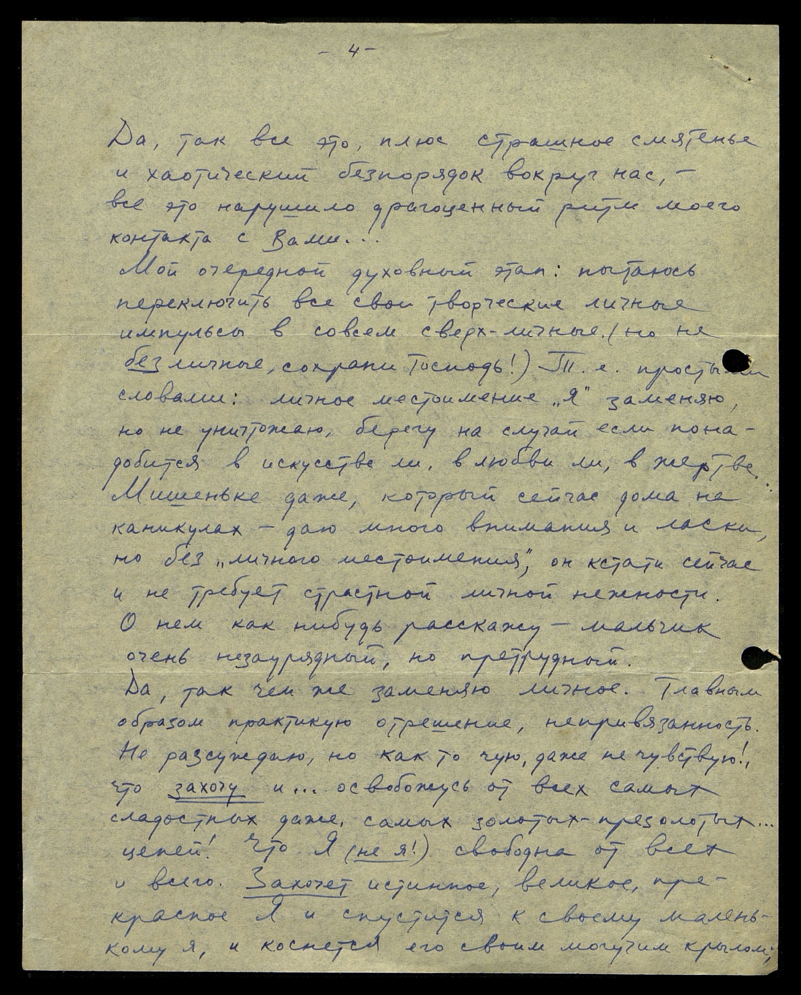 Мишеньке даже, который сейчас дома на каникулах, даю много внимания и ласки, но без "личного местоимения", он, кстати, сейчас и не требует страстной личной нежности. О нём как-нибудь расскажу — мальчик очень незаурядный, но претрудный.