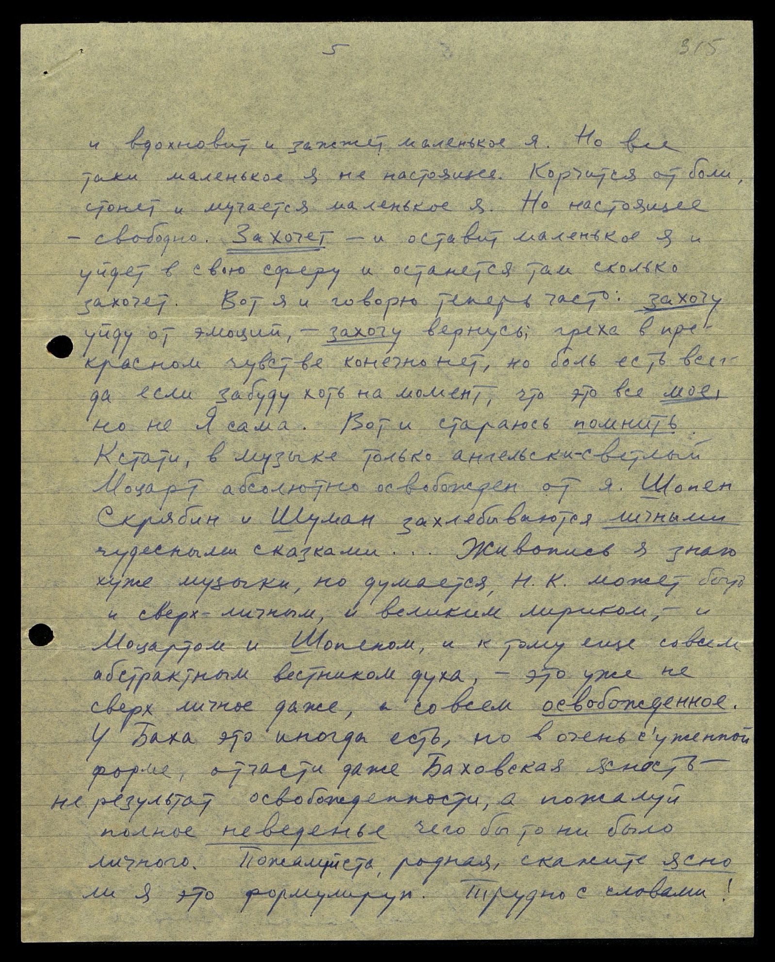 У Баха это иногда есть, но в очень суженной форме, отчасти даже Баховская ясность — не результат освобождённости, а пожалуй, полное неведение чего бы то ни было личного. Пожалуйста, родная, скажите ясно ли я это формулирую. Трудно с словами!
