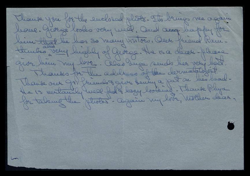 Thanks for the address of the dermatologist. Thank our Gr[eat] friends and give Henry a pat on his head. He is certainly well-fed and lazy-looking. Thank Raya for taking the photos. Again, my love, Mother dear.