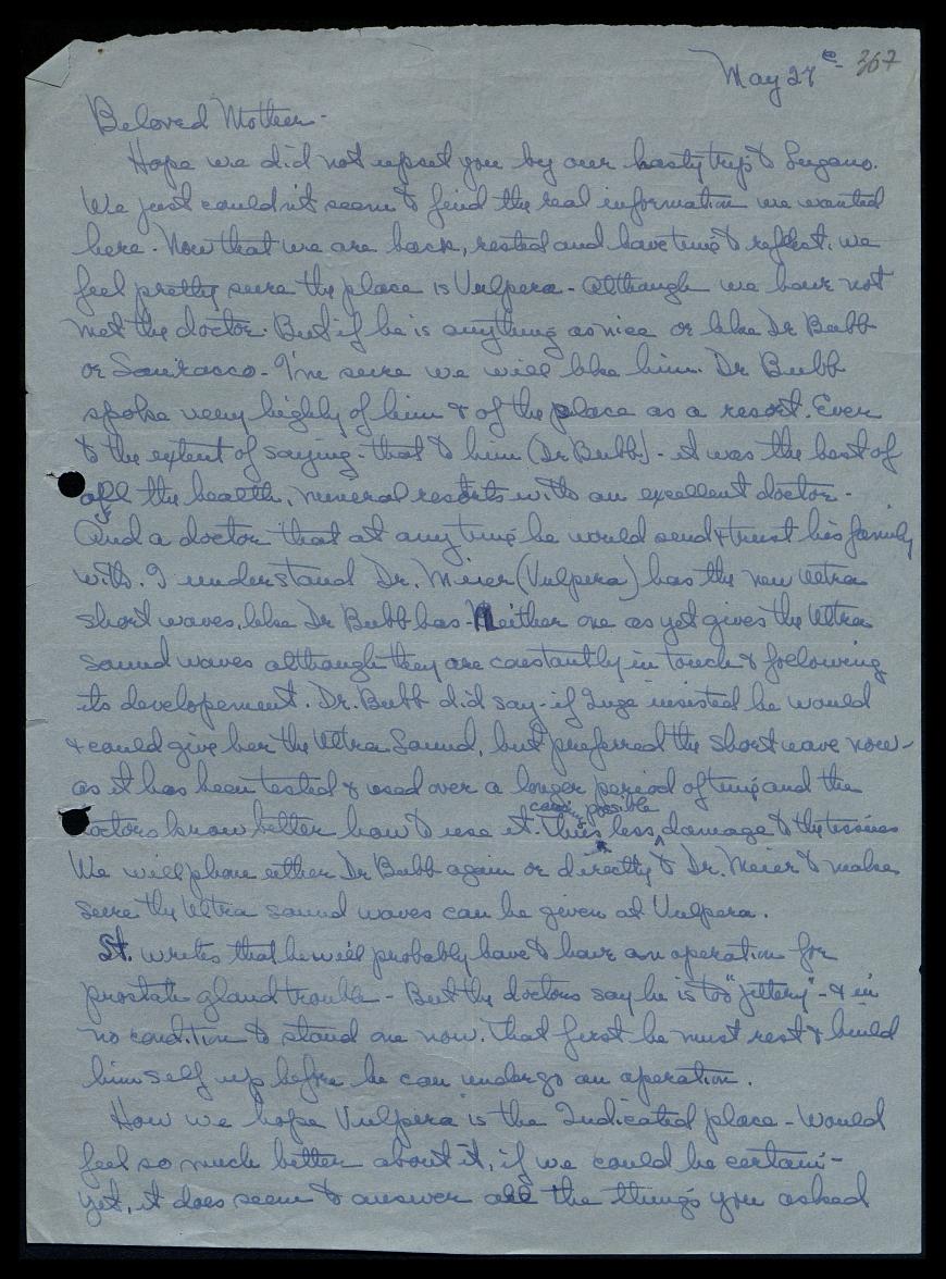 Надеюсь, мы не расстроили Вас нашей необдуманной поездкой в Лугано [Швейцария]. Мы просто не смогли найти здесь нужную нам информацию. Теперь, когда мы вернулись, отдохнули и у нас появилось время поразмыслить, мы уверены, что это место — Вульпера [Италия]. Хотя мы ещё не встречались с доктором, но если он такой же приятный человек, как доктор Бабб или Суракко, я уверена, он нам понравится. Доктор Бабб очень хорошо отзывался о нём и об этом месте как о курорте, даже в той мере, как это было сказано ему (доктору Баббу), это был лучший из всех оздоровительных минеральных курортов с отличным врачом, к которому он в любое время мог обратиться и которому доверил бы свою семью. Насколько я понимаю, у доктора Мейера (Вульпера), как и у доктора Бабба, есть новые ультракороткие волны. Ни один из них пока не использует ультразвуковые волны, хотя они постоянно поддерживают связь и следят за их развитием. Д-р Бабб сказал, что, если бы Инге настаивала, он бы мог сделать ей и ультразвуковую [терапию], но сейчас предпочитает коротковолновый метод, поскольку он был протестирован и использовался в течение более длительного периода времени, и врачи лучше знают, как его использовать, чтобы, возможно, нанести меньший ущерб тканям. Мы снова позвоним доктору Баббу или непосредственно доктору Мейеру, чтобы убедиться, что ультразвуковую терапию можно проводить в клинике Вульпера.