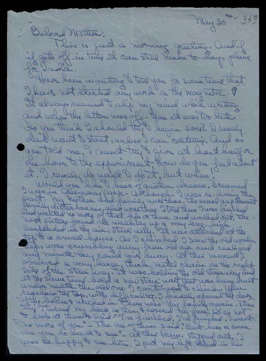Also, the night of the twenty-eighth, I saw a large, thin hand holding an air mail envelope in front of me to see. I looked and looked and tried to see where and who it was from but could not. Then I asked, “Is it from [Leo] St[ern] or Rami?” There was no answer. The next morning, the air mail letter, the same shape and size as the one I saw, arrived. It was from Rami. He seems to be quite upset.