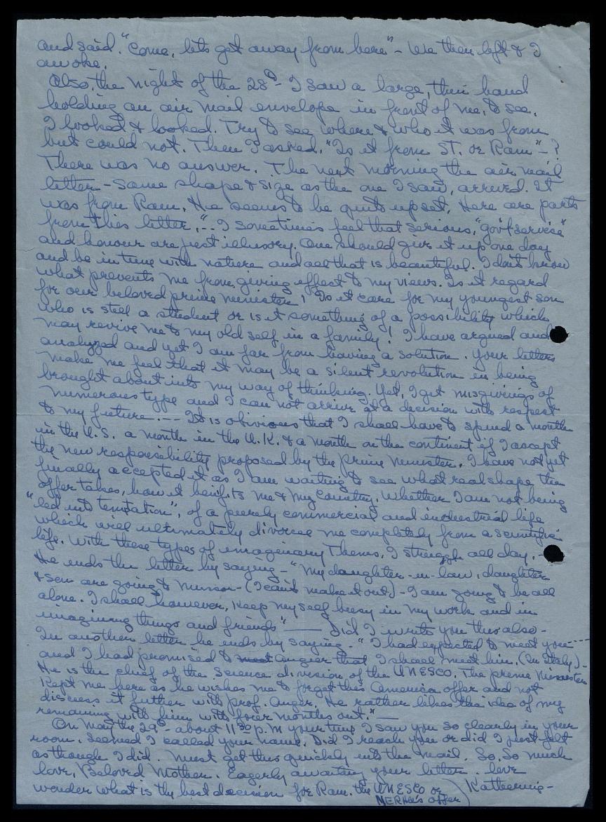 He ends the letter by saying, “My daughter-in-law, daughter, and son are going to Mussor (I can’t make it out). I am going to be all alone. I shall, however, keep myself busy in my work and in imagining things and friends.” Did I write you this also in another letter he ends by saying, “I had expected to meet you and I had promised to Prof. Augier[???] that I shall meet him (in Italy). He is the chief of the science division of the UNESCO. The prime minister kept me here, as he wishes me to forget the American offer and not discuss it further with Prof. Augier[?]. He rather likes the idea of my remaining with him with four months out.”