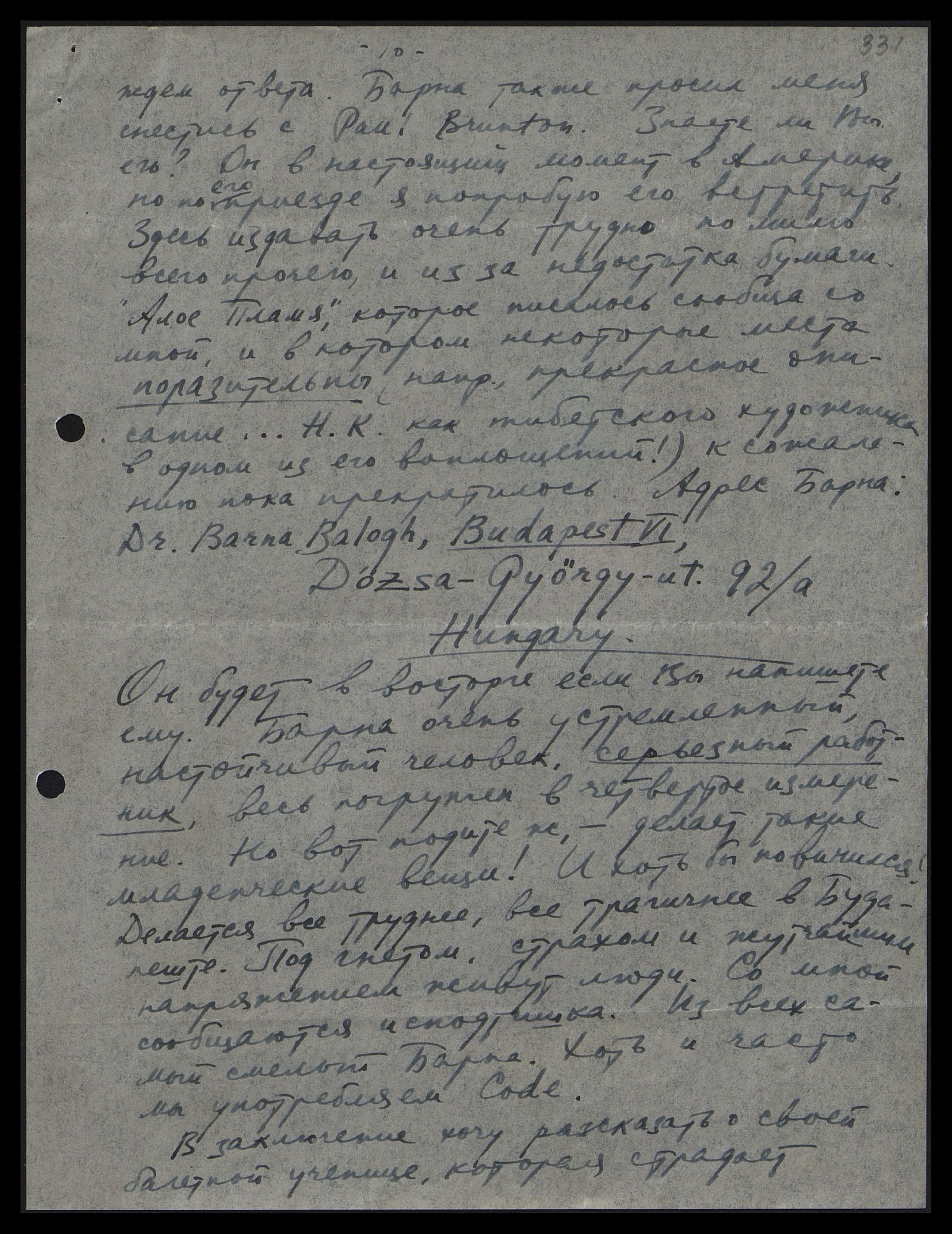ждём ответа. Барна также просил меня снестись с Paul Brunton [англ.: Полем Брунтоном]. Знаете ли Вы его? Он в настоящий момент в Америке, но по его приезде я попробую его встретить. Здесь издавать очень трудно, по мимо всего прочего и из-за недостатка бумаги. "Алое Пламя", которое писалось сообща со мной, и в котором некоторые места поразительны (например, прекрасное описание... Н[иколая] К[онстантиновича] как тибетского художника в одном из его воплощений!), к сожалению, пока прекратилось. Адрес Барна: