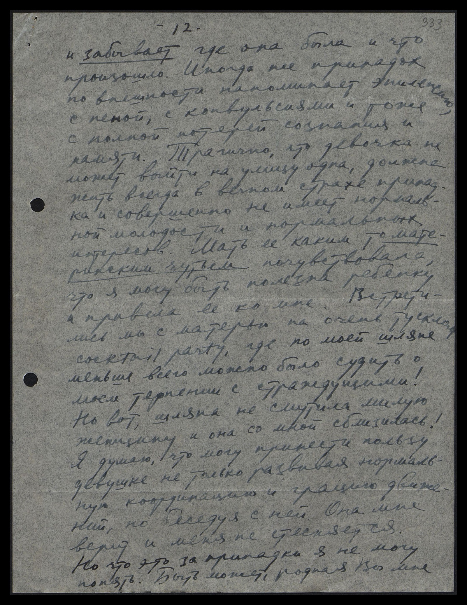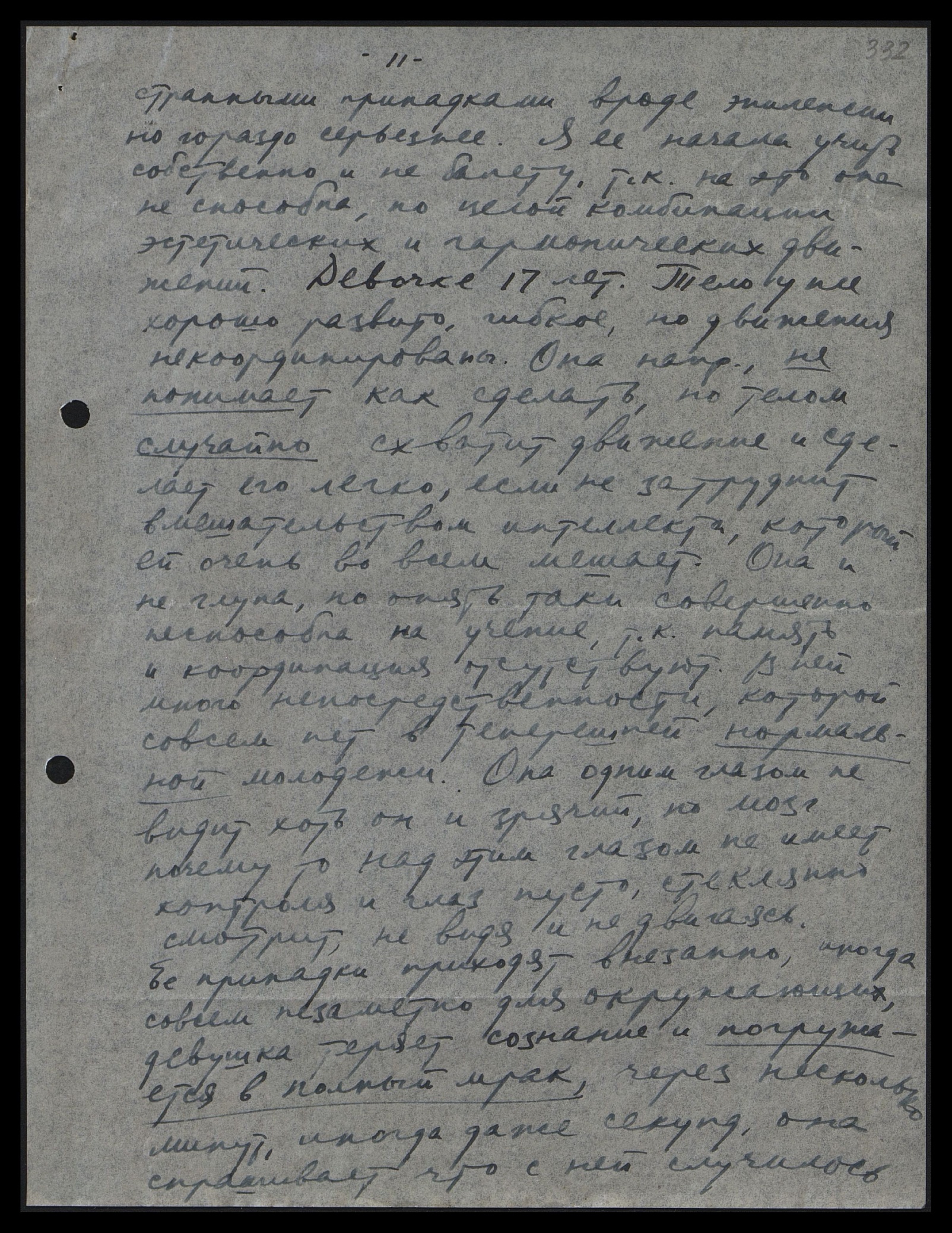 странными припадками вроде эпилепсии, но гораздо серьёзнее. Я её начала учить собственно и не балету, так как на это она и не способна, по целой комбинации эстетических и гармонических движений. Девочке 17 лет. Тело у неё хорошо развито, гибкое, но движения некоординированы. Она напр[имер], не понимает, как сделать, но телом, случайно схватит движение и сделает его легко, если не затруднит вмешательством интеллекта, который ей очень во всём мешает. Она и не глупа, но опять-таки совершенно не способна на учение, так как память и координация отсутствуют. В ней много непосредственности, которой совсем нет в теперешней нормальной молодежи. Она одним глазом не видит, хоть он и зрячий, но мозг почему-то над этим глазом не имеет контроля и глаз пусто, стеклянно смотрит, не видя и не двигаясь. Ее припадки приходят внезапно, иногда совсем незаметно для окружающих, девушка теряет сознание и погружается в полный мрак, через несколько минут, иногда даже секунд, она спрашивает, что с ней случилось,