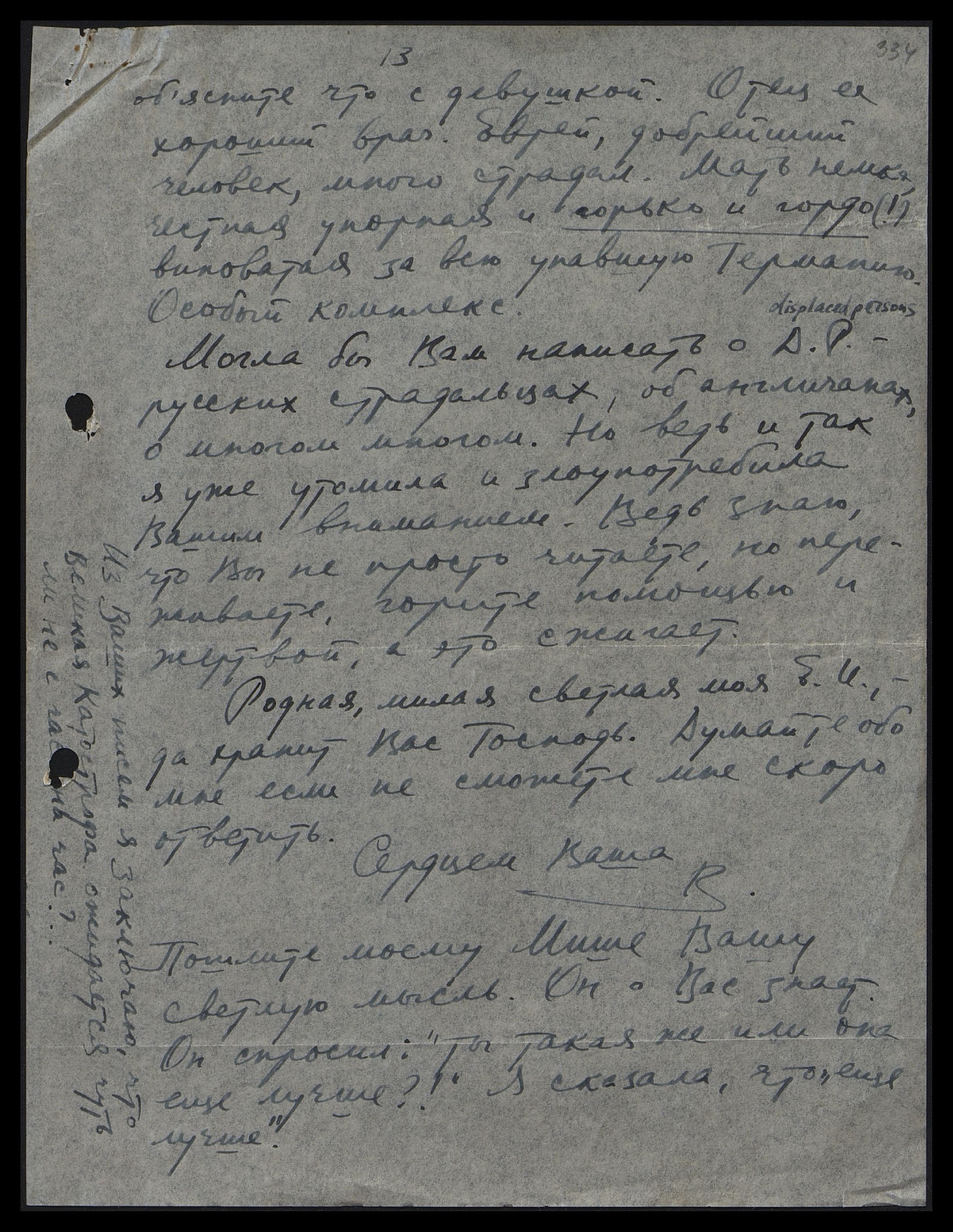 объясните, что с девушкой. Отец её хороший врач. Еврей, добрейший человек, много страдал. Мать — немка, честная, упорная и горько и гордо (!) виноватая за всю упавшую Германию. Особый комплекс.