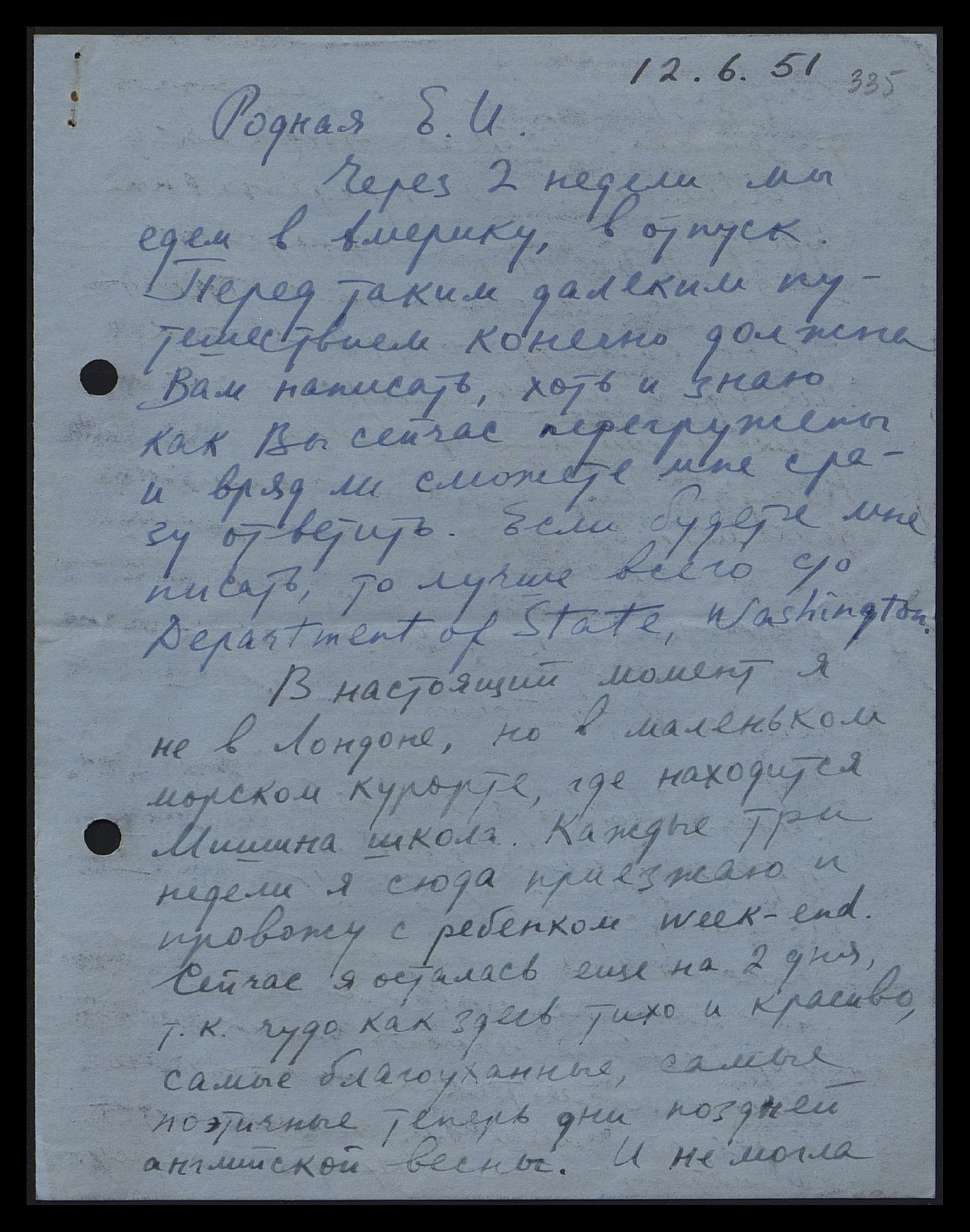 Через 2 недели мы едем в Америку, в отпуск. Перед таким далёким путешествием, конечно, должна Вам написать, хоть и знаю, как Вы сейчас перегружены и вряд ли сможете мне сразу ответить. Если будете мне писать, то лучше всего с/о Department of State, Wahingtone [англ.: Государственный Департамент, Вашингтон].