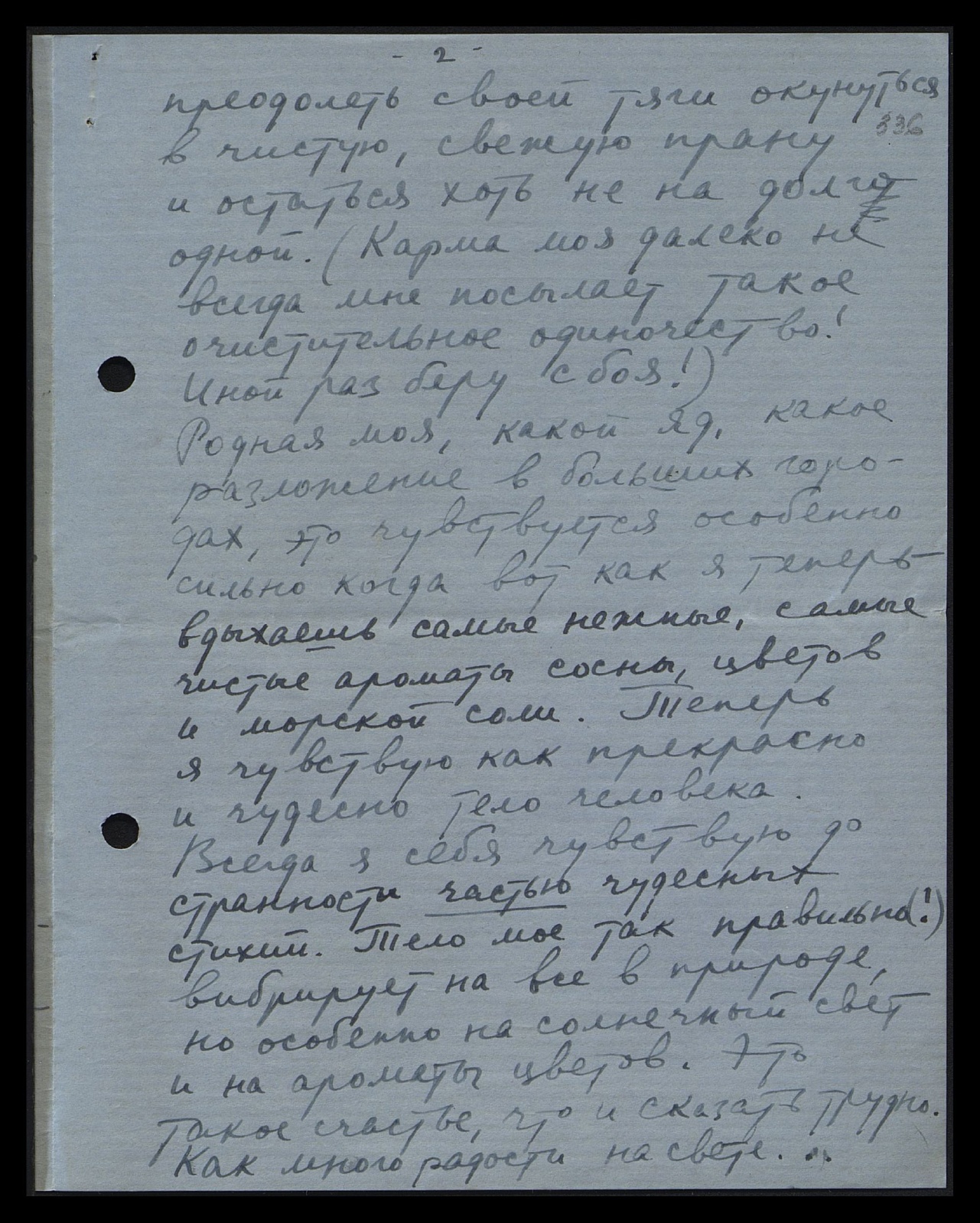 Родная моя, какой яд, какое разложение в больших городах, это чувствуется особенно сильно, когда, вот как я теперь, вдыхаешь самые нежные, самые чистые ароматы сосны, цветов и морской соли. Теперь я чувствую, как прекрасно и чудесно тело человека. Всегда я себя чувствую до странности частью чудесных стихий. Тело моё так правильно (!) вибрирует на всё в природе, но особенно на солнечный свет и на ароматы цветов. Это такое счастье, что и сказать трудно. Как много радости на свете...