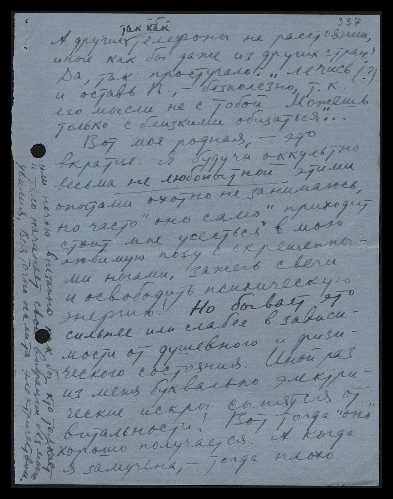 А другие, так как телефоны на расстоянии, иные как бы даже из других стран! Да, так постучало: "Лечись (?) и оставь П. — бесполезно, так как его мысли не с тобой. Можешь только с близкими общаться"...