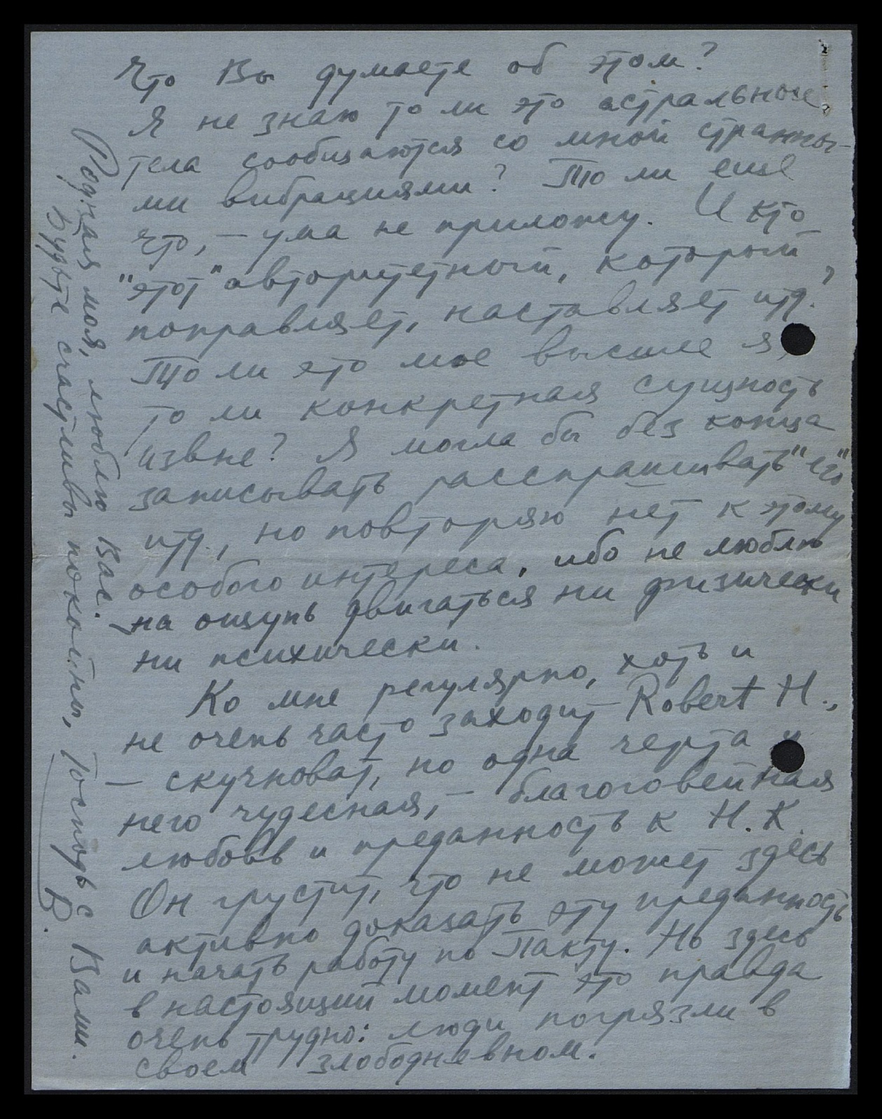 Ко мне регулярно, хоть и не очень часто, заходит Robert H., — скучноват, но одна черта у него чудесная: благоговейная любовь и преданность Н[иколаю] К[онстантиновичу]. Он грустит, что не может здесь активно доказать эту преданность и начать работу по Пакту. Но здесь в настоящий момент это правда очень трудно: люди погрязли в своём злободневном.