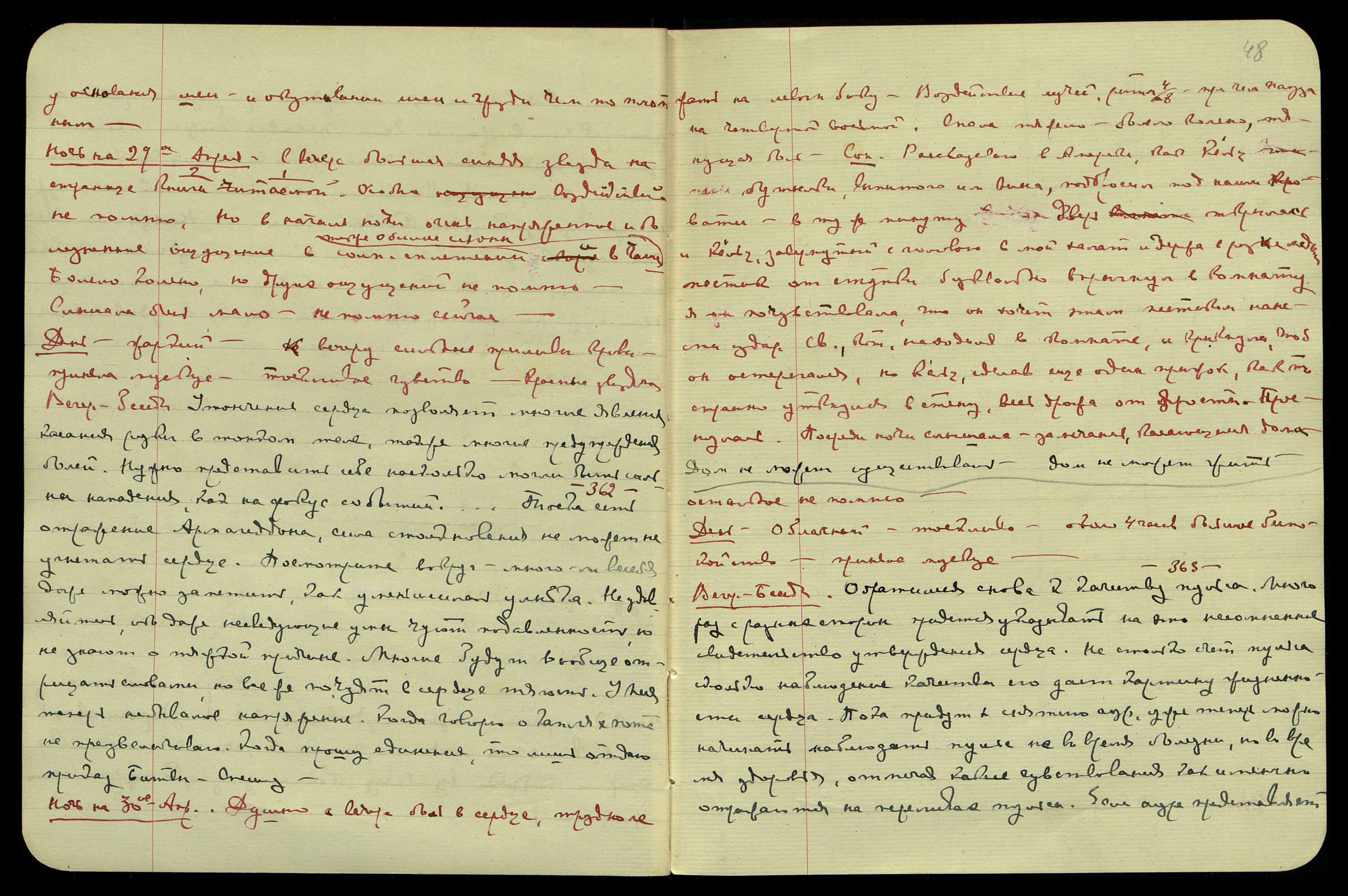 Ночь на 11-е мая. Прохладно, тучно. С вечера вспышки серебрян[ого] огня во мне. Охлаждающие лучи и мураши, или сокращения нервов, от них очень сильны. Спала много, слышала, не записывала, помню восклицание Зины: "Это какой-то сумасшедший дом!... Он достигнет..." Упоминание о бельгийск[ом] прав[ительстве], не помню в связи ли с выставкой Тюльпинга