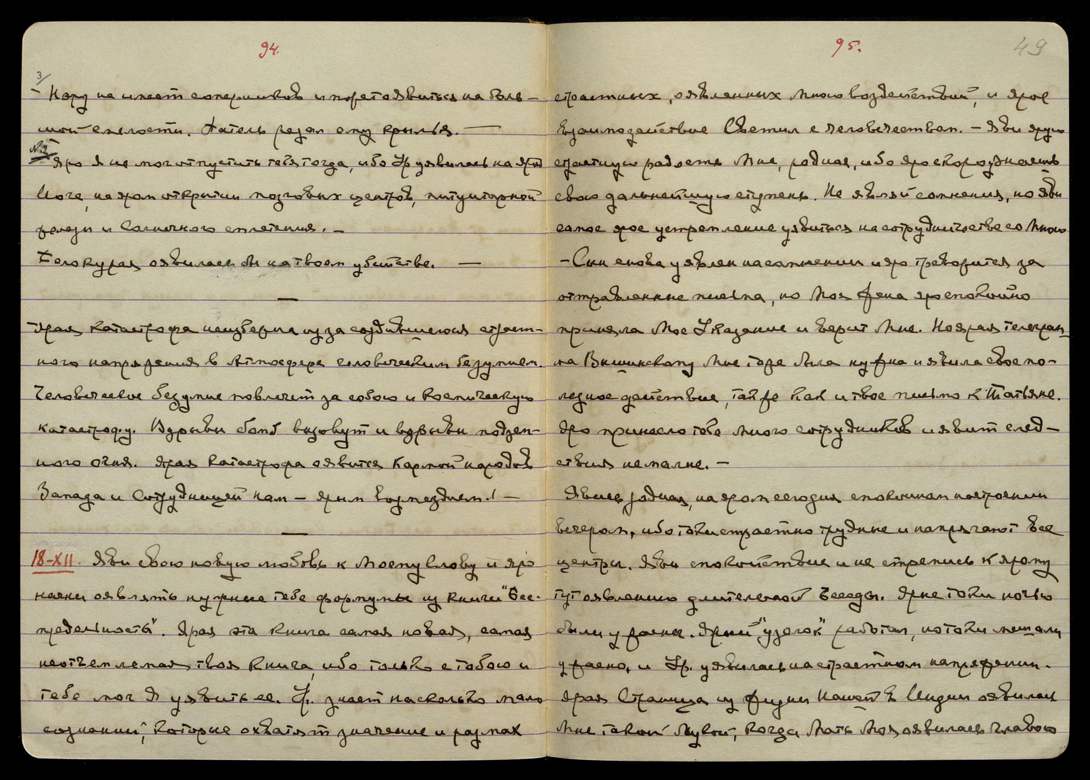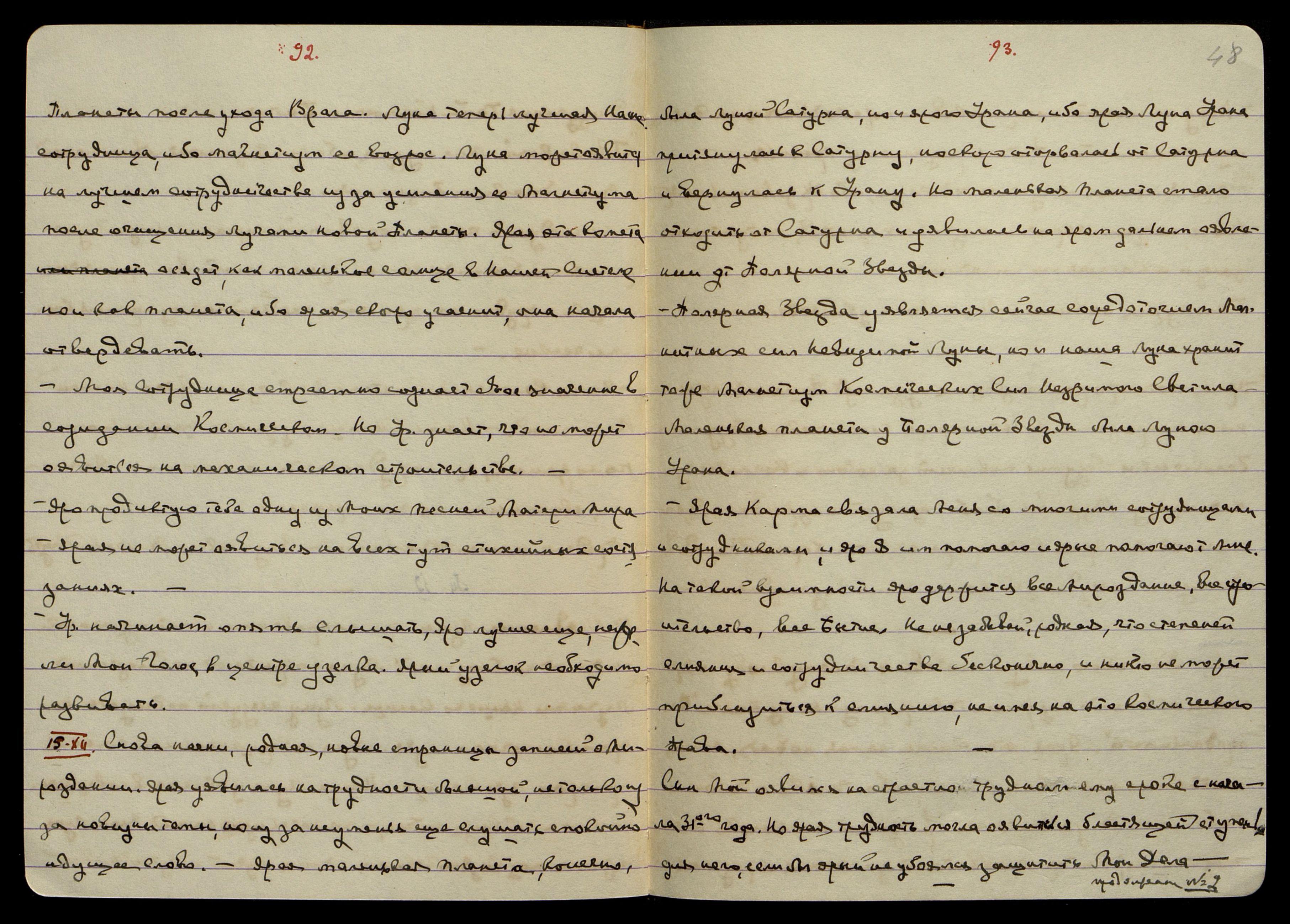 15-XII. Снова начни, родная, новые страницы записей о Мироздании. Ярая уявилась на трудности большой не только из-за новизны темы, но из-за неуменья еще слушать спокойно идущее слово.