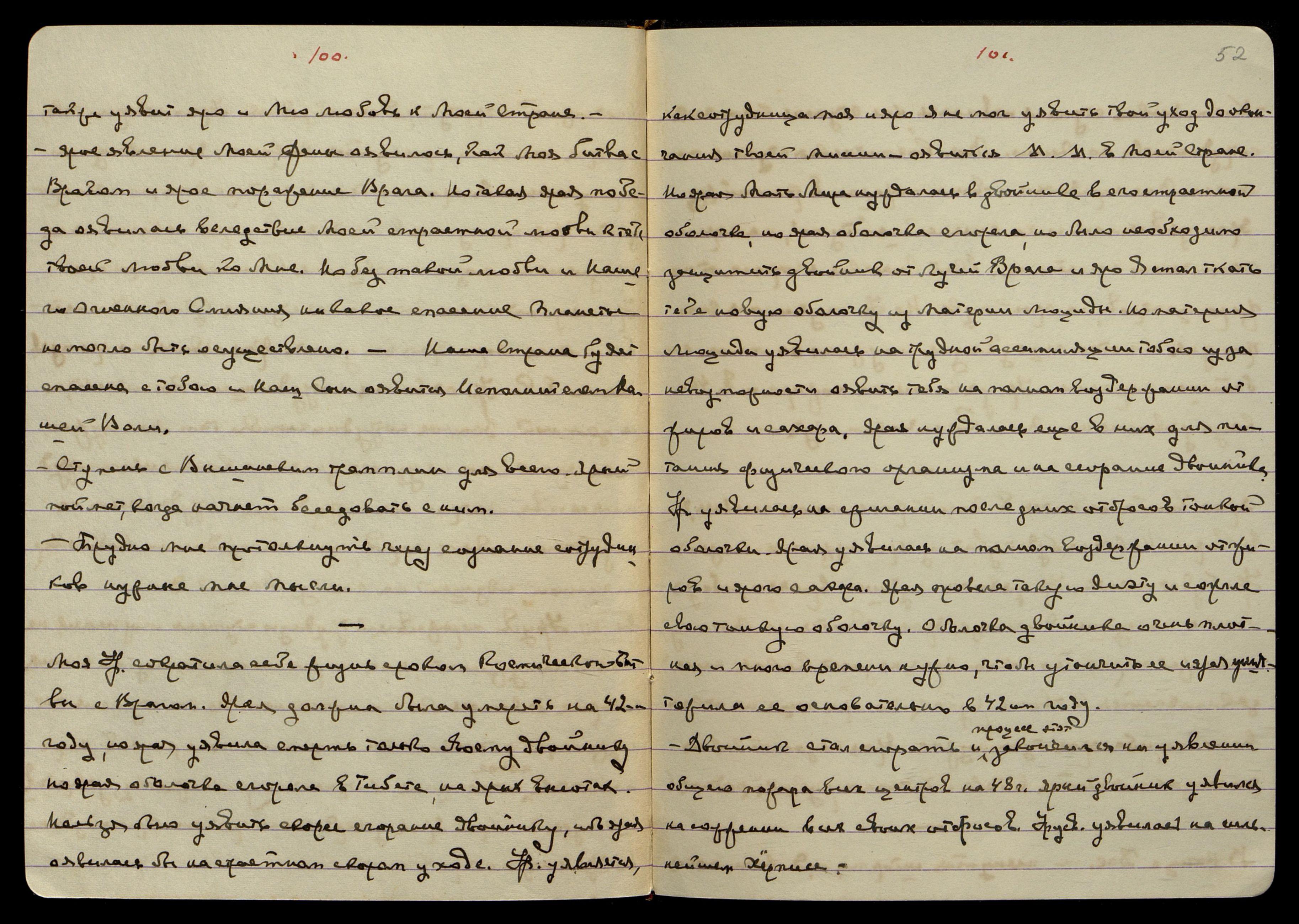 Ярая может знать, но ярая никому не скажет, что армии в Евр[опе] погибнут от Катастрофы. Ярая бомба, брошенная Амер[иканским] летчиком оявит гибель войск союзн[ических] с Ам[ерикой] в С[еверной] К[орее] со всем их Штабом. Но после Катастрофы Моя страна оявится на страстно новом событии. Ярая Евр[опейская] Р[оссия] отделится по Уралу от Сибири из-за нежелания дать свободу самоуправления Монг[олии], Тиб[ету] и Кор[ее] − пожелает снова вводить коммунизм.