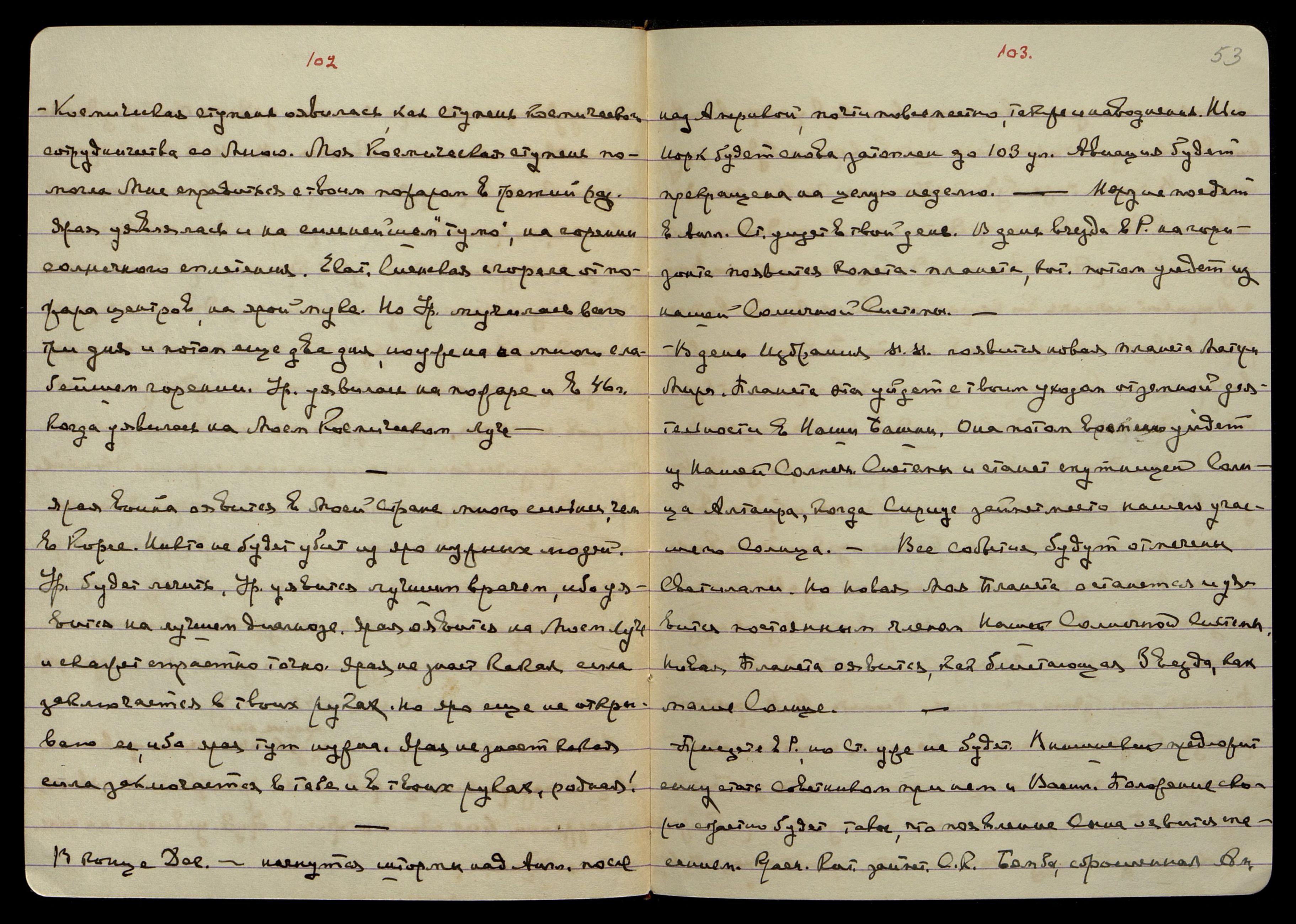 Приедете в Р[оссию], но Ст[алина] уже не будет. Вышинский предложит сыну стать Советником при нем и Васил[евском]. Положение скоро страстно будет такое, что появление Сына оявится спасением. Красн[ый] Кит[ай] займет С[инь-]К[иянг]. Бомба, сброшенная Ам[ериканским]