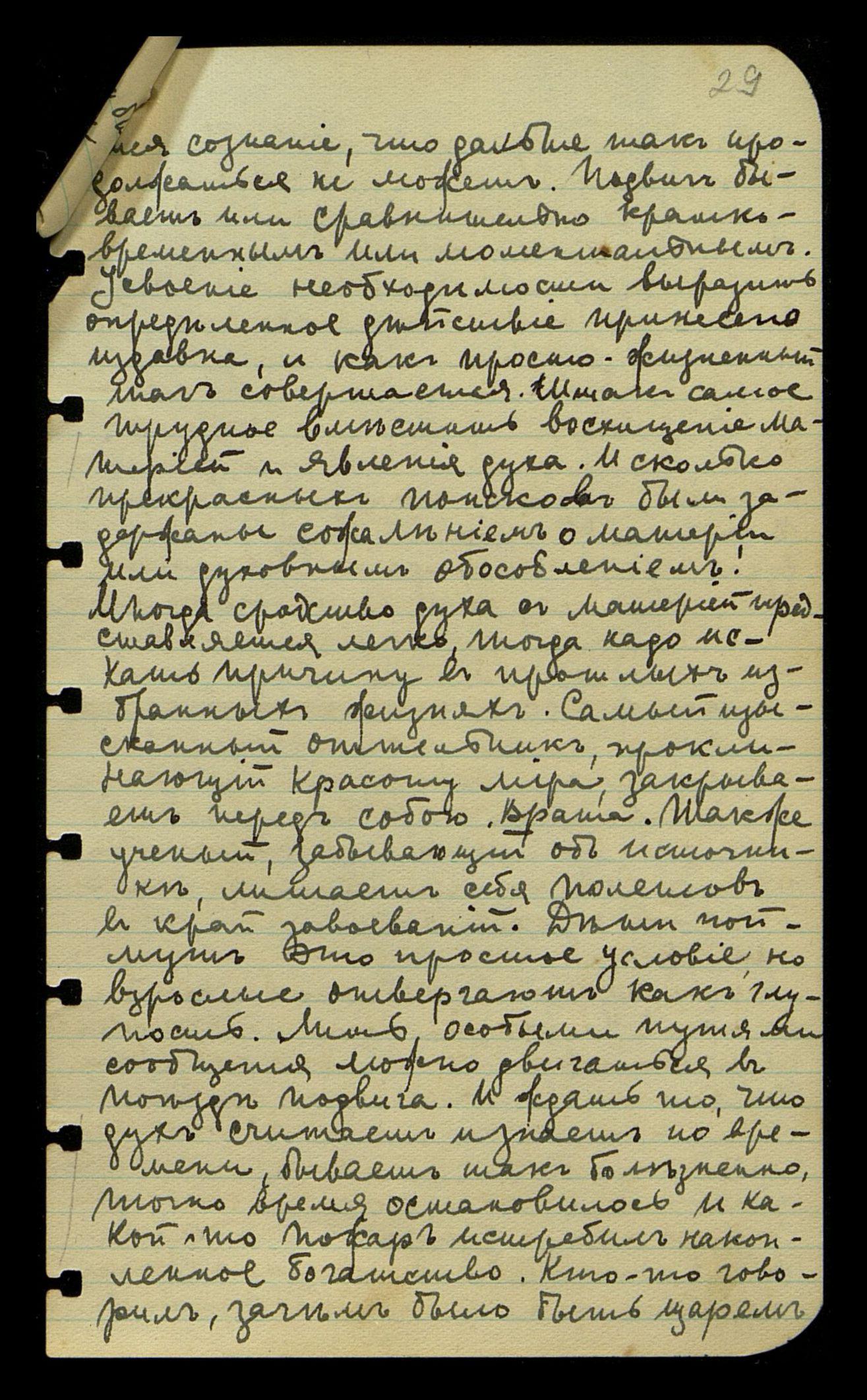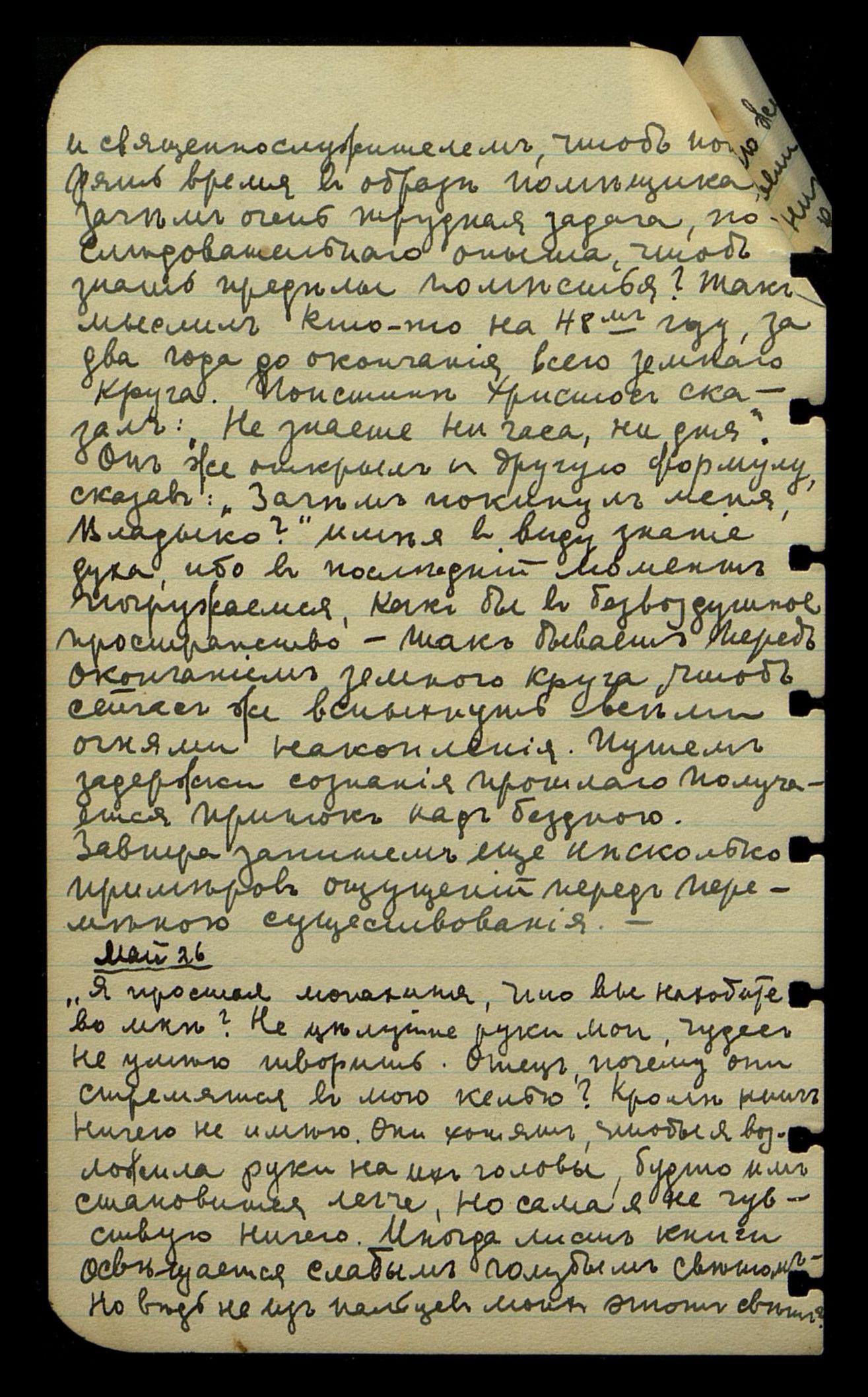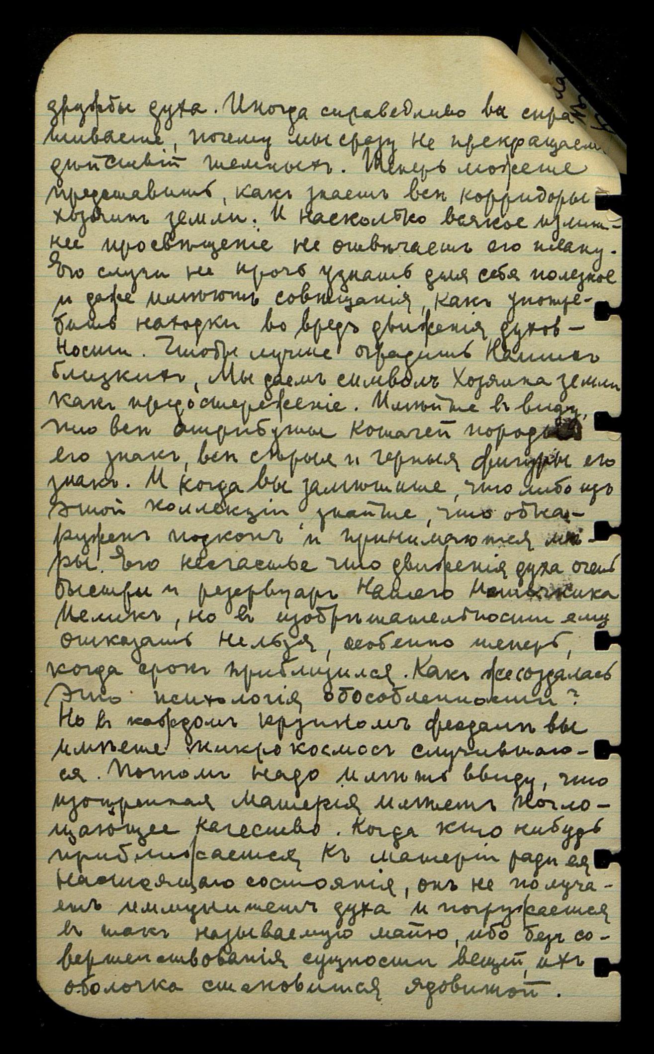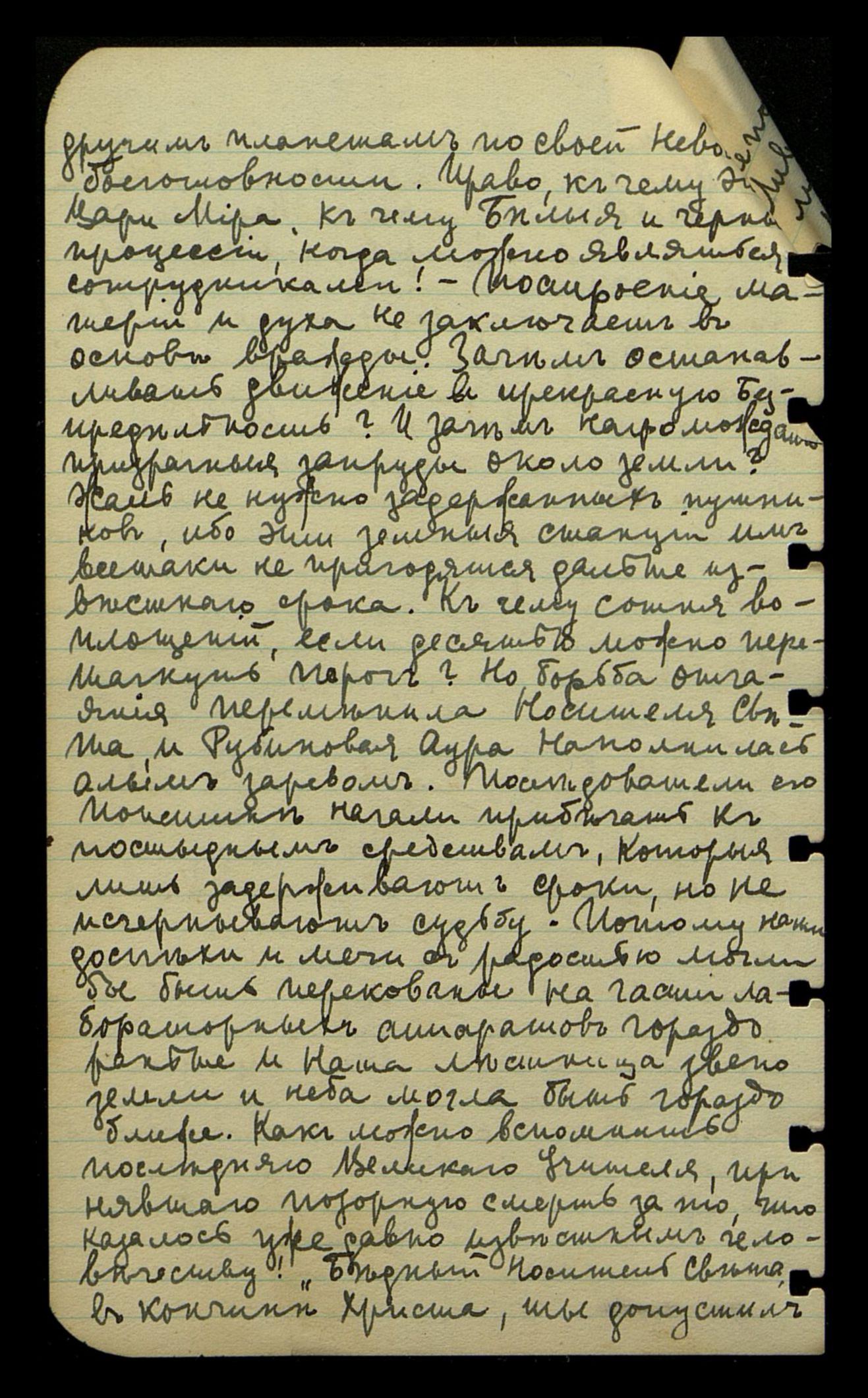 и священнослужителем, чтоб потерять время в образе помещика? Зачем очень трудная задача последовательного опыта, чтоб знать пределы поместья?" Так мыслил кто-то на 48-м году, за два года до окончания всего земного круга. Поистине, Христос сказал: "Не знаете ни часа, ни дня". Он же открыл и другую формулу, сказав: "Зачем покинул меня, Владыко?", имея в виду знание духа, ибо в последний момент погружаемся как бы в безвоздушное пространство. Так бывает перед окончанием земного круга, чтоб сейчас же вспыхнуть всеми огнями накопления. Путем задержки сознания прошлого получается приток над бездною.
