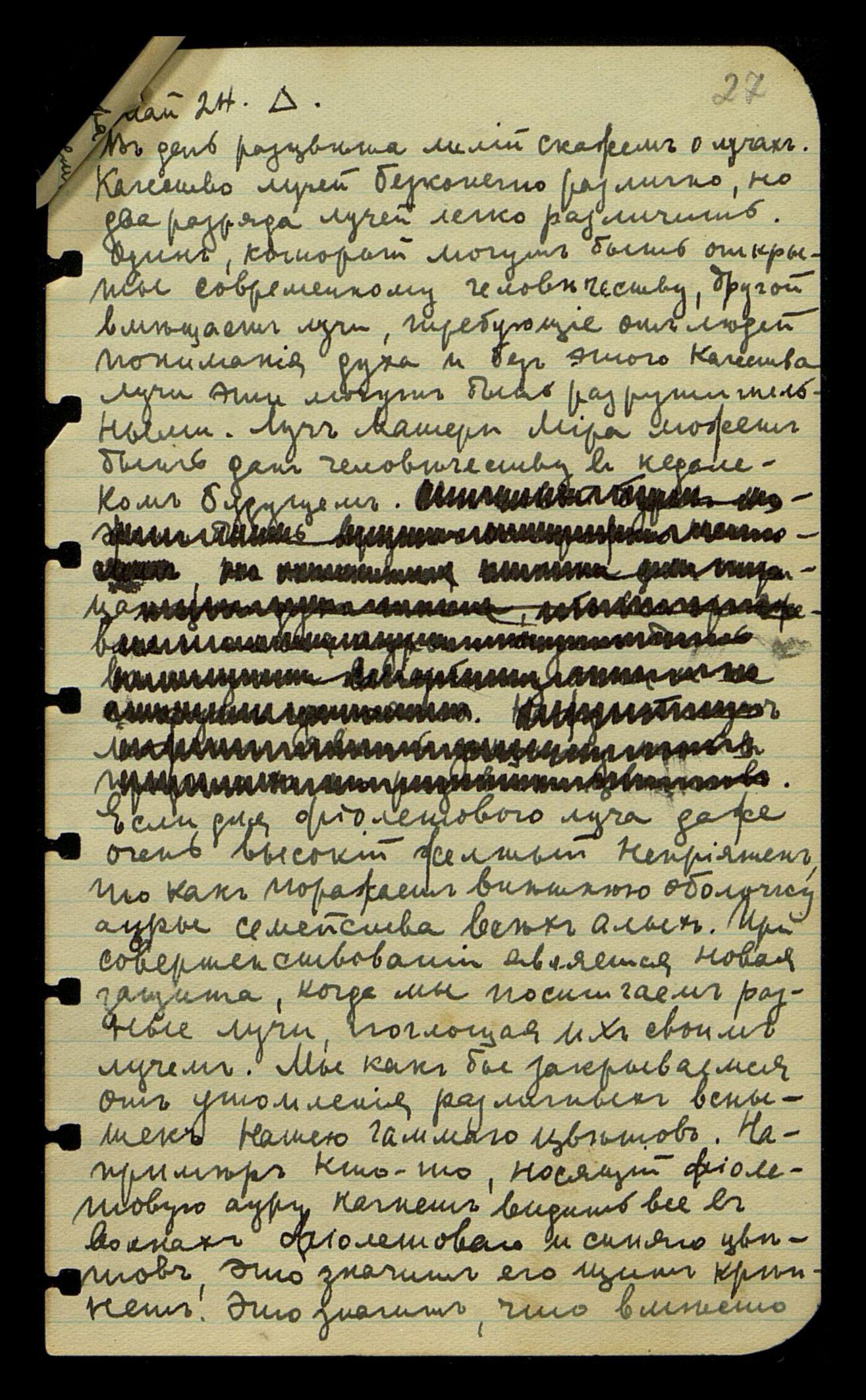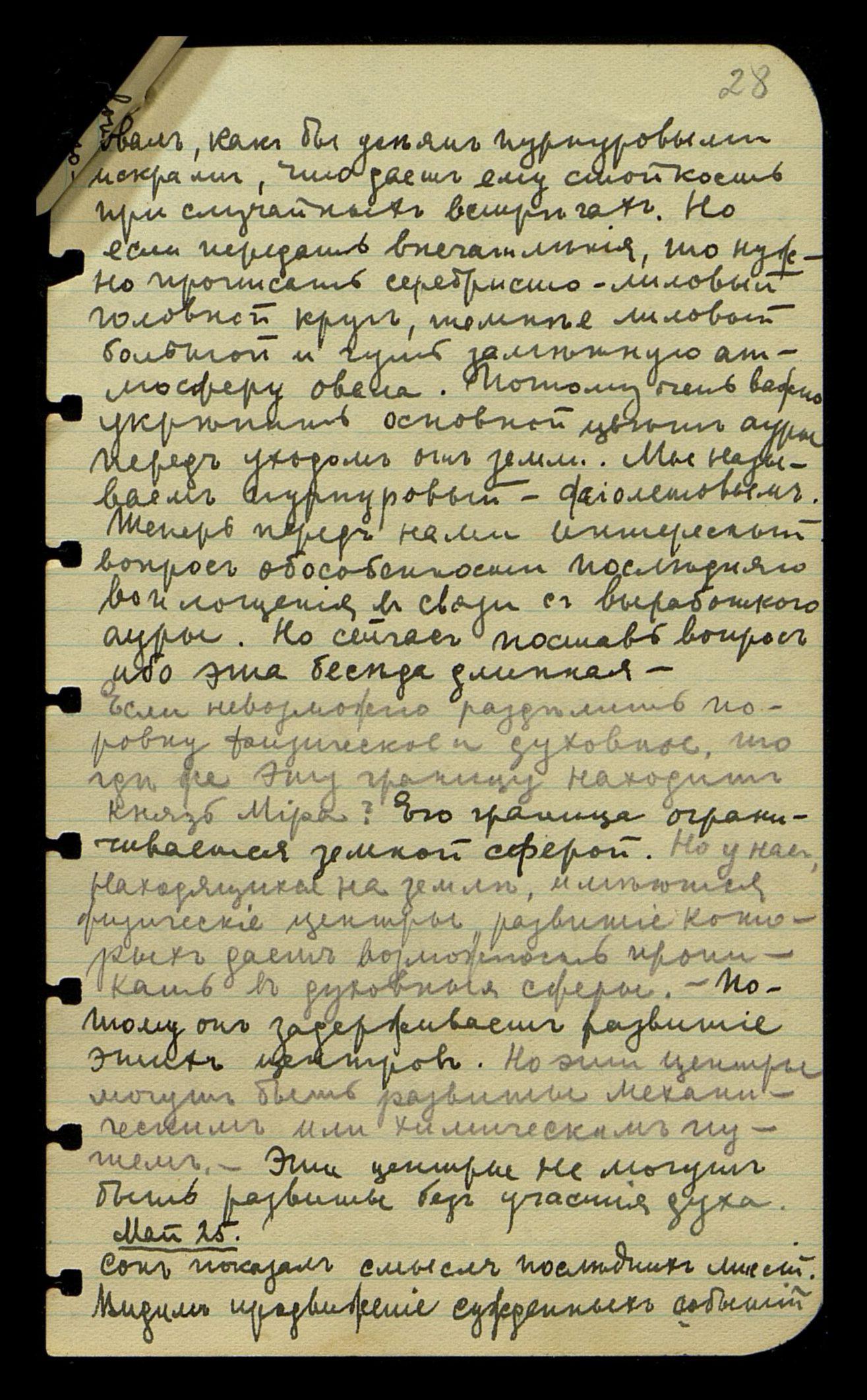 овал как бы усеян пурпуровыми искрами, что дает ему стойкость при случайных встречах. Но если передать впечатления, то нужно прописать серебристо-лиловый головной круг, темнее лиловый большой и чуть заметную атмосферу овала. Потому очень важно укрепить основной цвет ауры перед уходом от Земли. Мы называем пурпуровый фиолетовым. Теперь перед нами интересный вопрос об особенности последнего воплощения в связи с выработкою ауры. Но сейчас поставь вопрос, ибо эта беседа длинная.