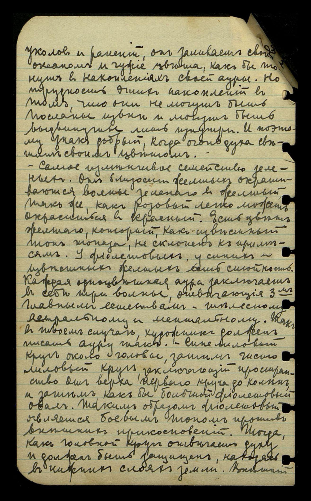 Самое изменчивое − семейство зеленых. От близости желтых окрашиваются волны зеленого в желтый, так же как розовый легко может окраситься в красный. Есть цвет желтого, который, как известный тон топаза, не склонен к примесям. У фиолетовых, у синих и известных желтых есть стойкость. Каждая одноцветная аура заключает в себе три волны, отвечающие трем главным естествам − телесному, астральному и ментальному. Так, в твоем случае художник должен писать ауру так: сине-лиловый круг около головы, затем чисто лиловый круг, заключающий пространство от верха первого круга до колен, и затем как бы большой фиолетовый овал. Таким образом, фиолетовый является боевым тоном против внешних прикосновений. Тогда как головной круг отвечает духу и должен быть защищен, находясь в нижних слоях земли. Внешний