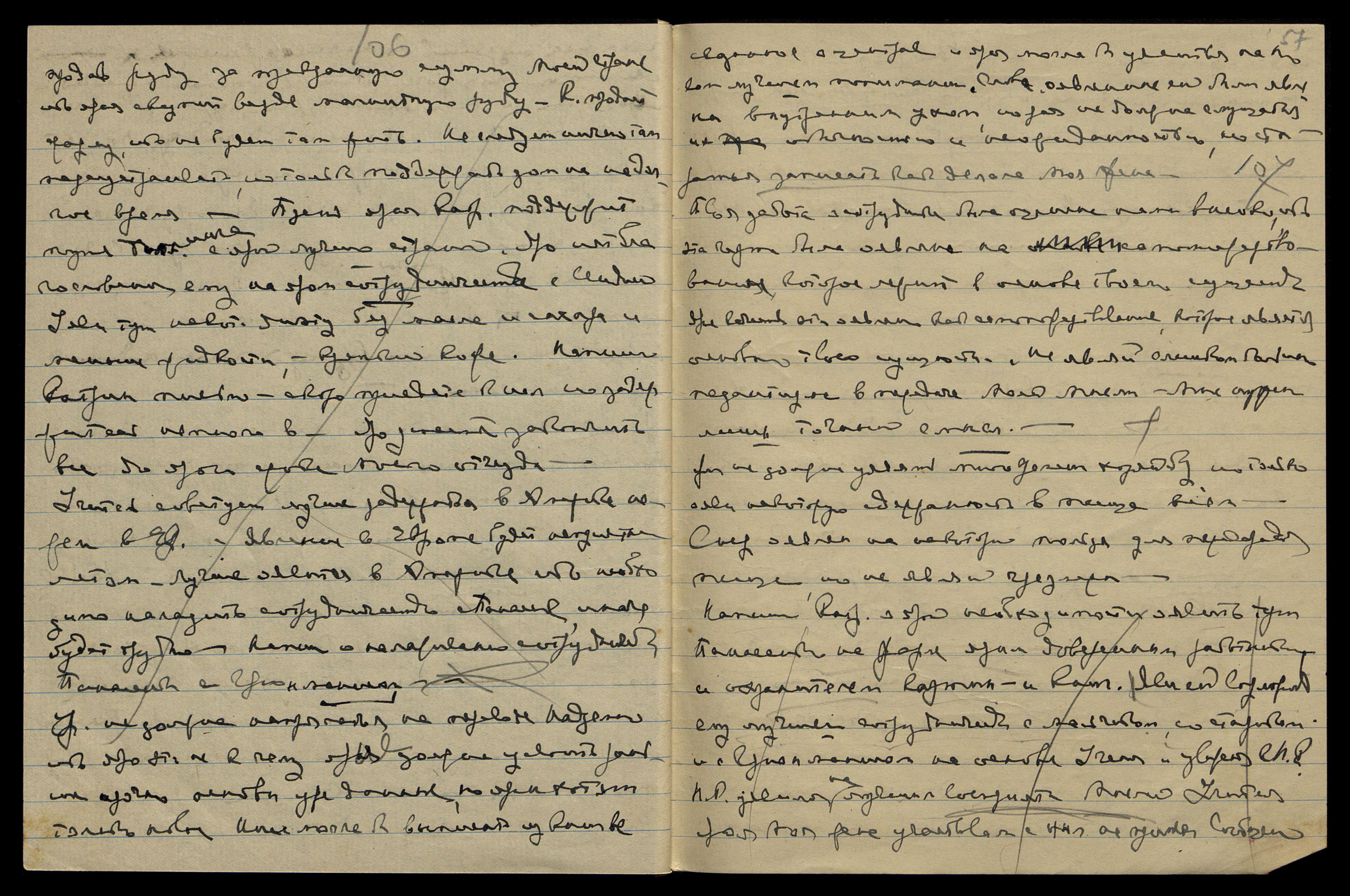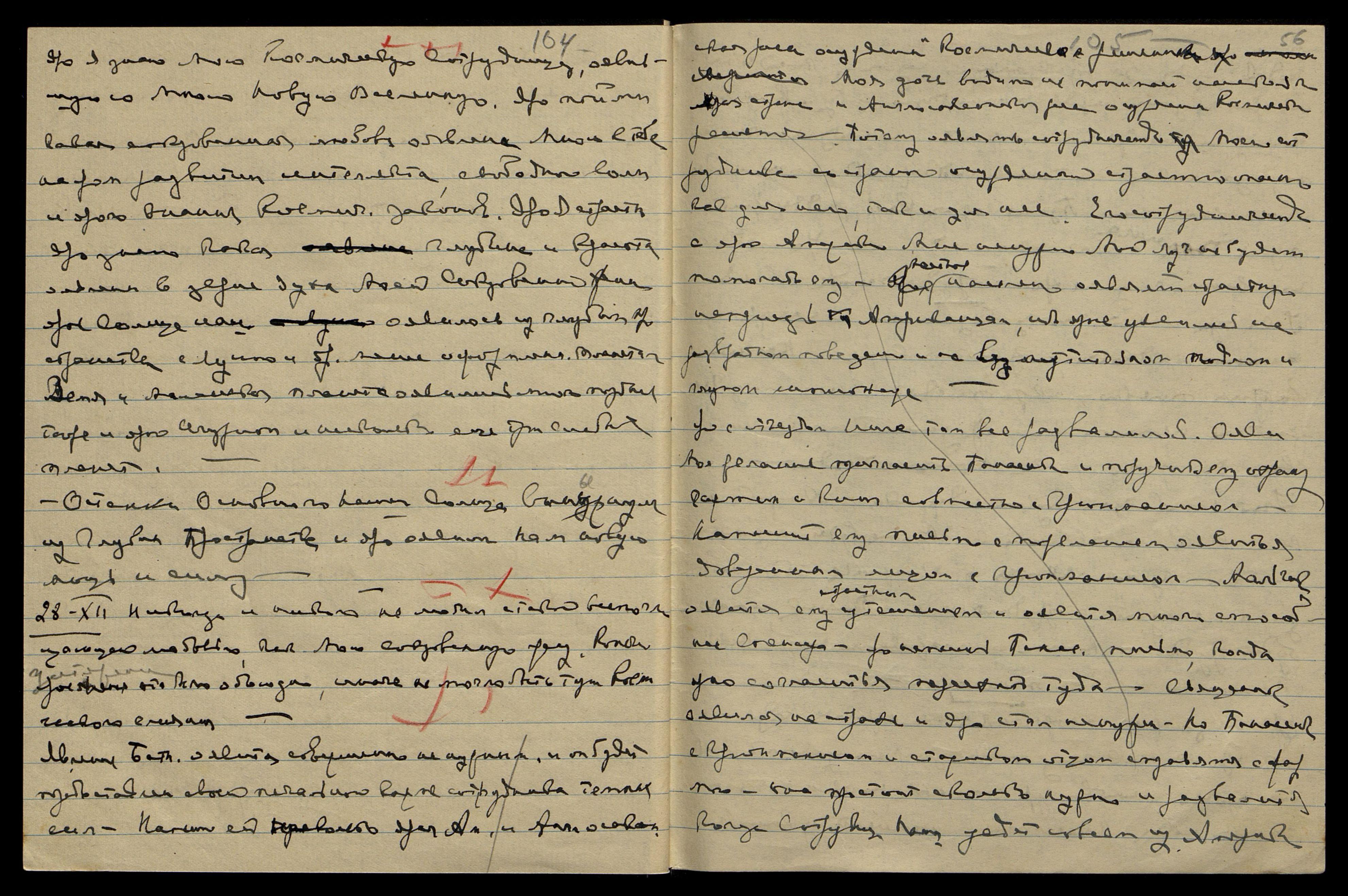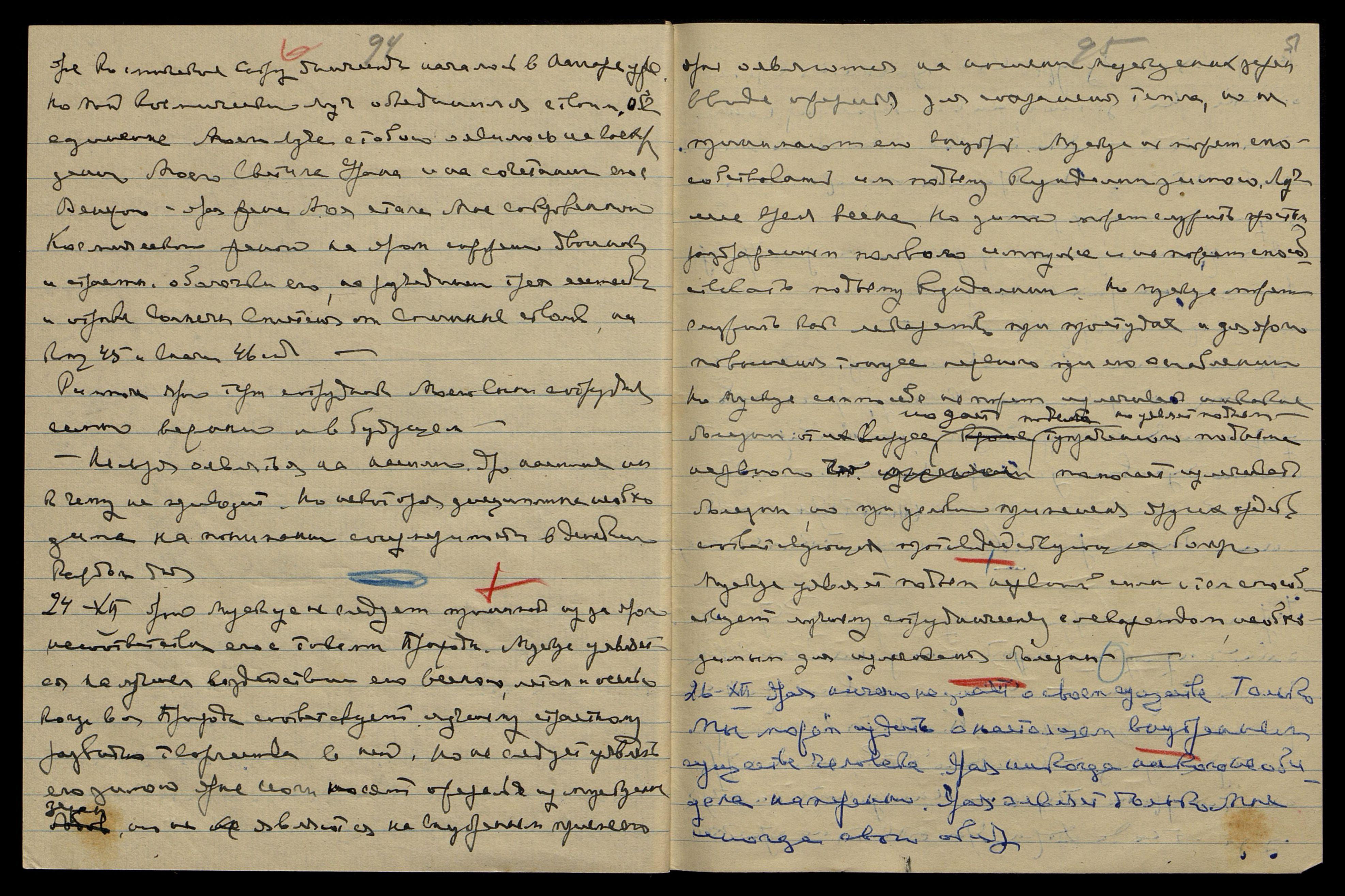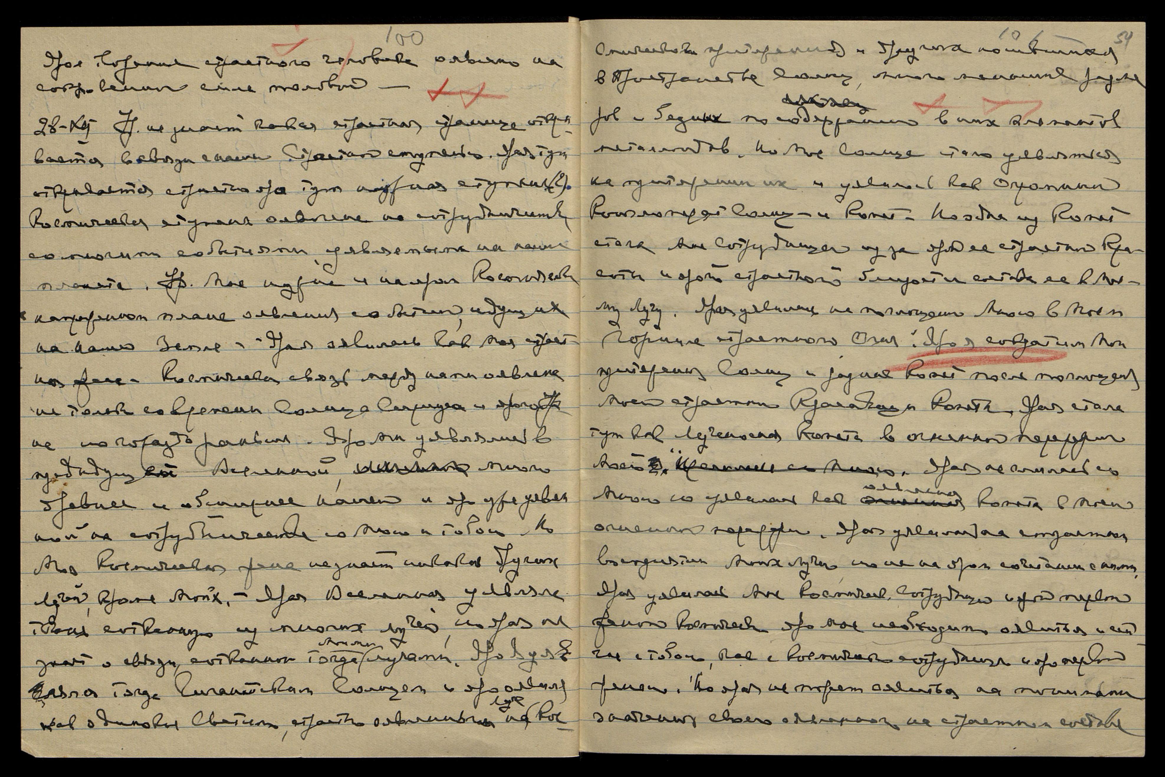 Уяви тут некот[орую] диету без масла и сахара и меньше жидкости — крепкий кофе. Напиши Катрин письмо: "Скоро приедете к нам, но задержитесь немного в ... Яро успеете закончить все до ярого срока Моего отъезда. Учитель советует лучше задержаться в Америке, нежели в Евр[опе]. Явление в Европе будет неприятно летом. Лучше оявиться в Америке, ибо необходимо наладить сотрудничество с Панасенко, иначе будет трудно". Напиши о налаживании сотрудничества Панасенко с Грюнманисом.