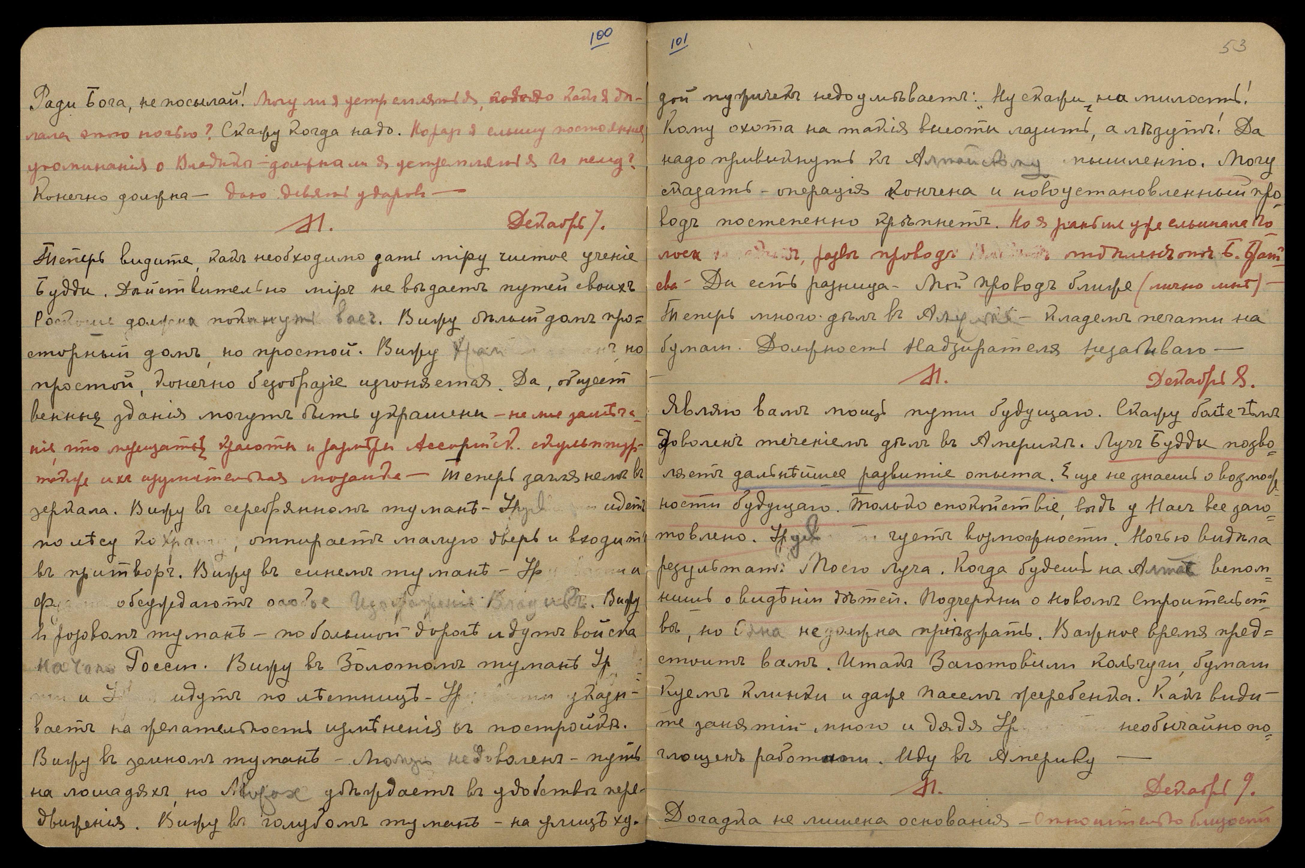 — Недостатка не будет. Видение хорошее. Также Скажу — велико будет поражение здесь. Ф[уяма] строит в Америке. Может Л[юмоу] спокойно работать, ибо Стою за ним. Урусвати радость идет. Иду в Америку.