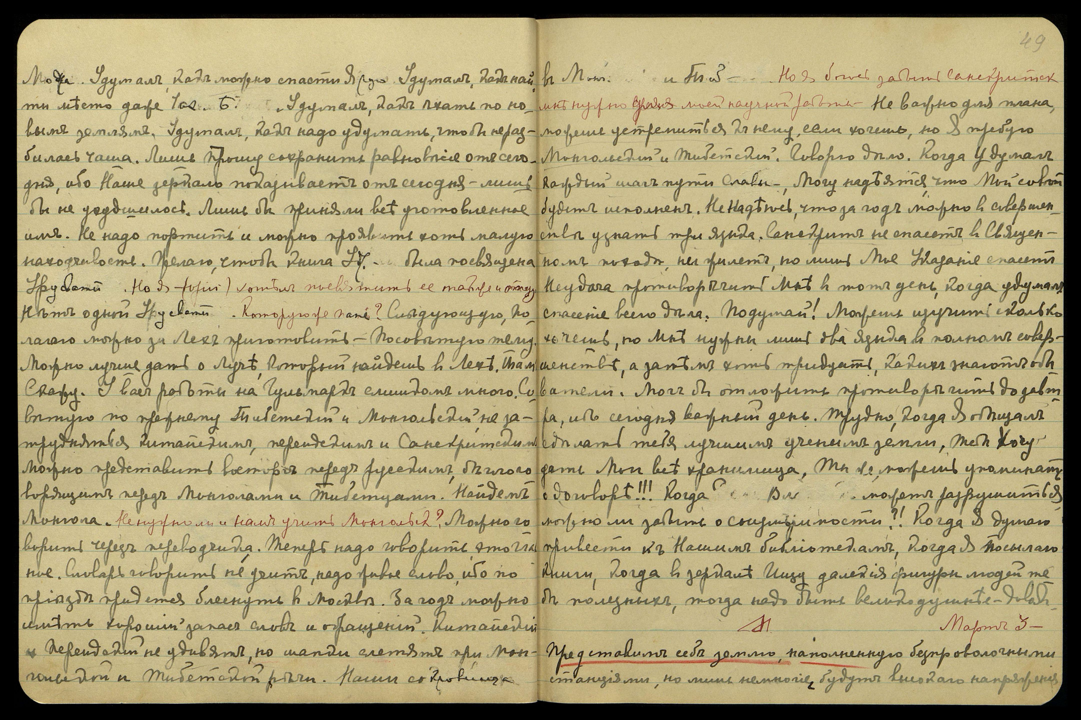 — Можно говорить через переводчика. Теперь надо говорить, это главное. Словарь говорить, не учит, надо живое слово, ибо по приезде придётся блеснуть в Москве. За год можно иметь хороший запас слов и обращений. Китайский и персидский не удивят, но шапки слетят при монгольской и тибетской речи. Наши сокровища в Монг[олии] и Тиб[ете].