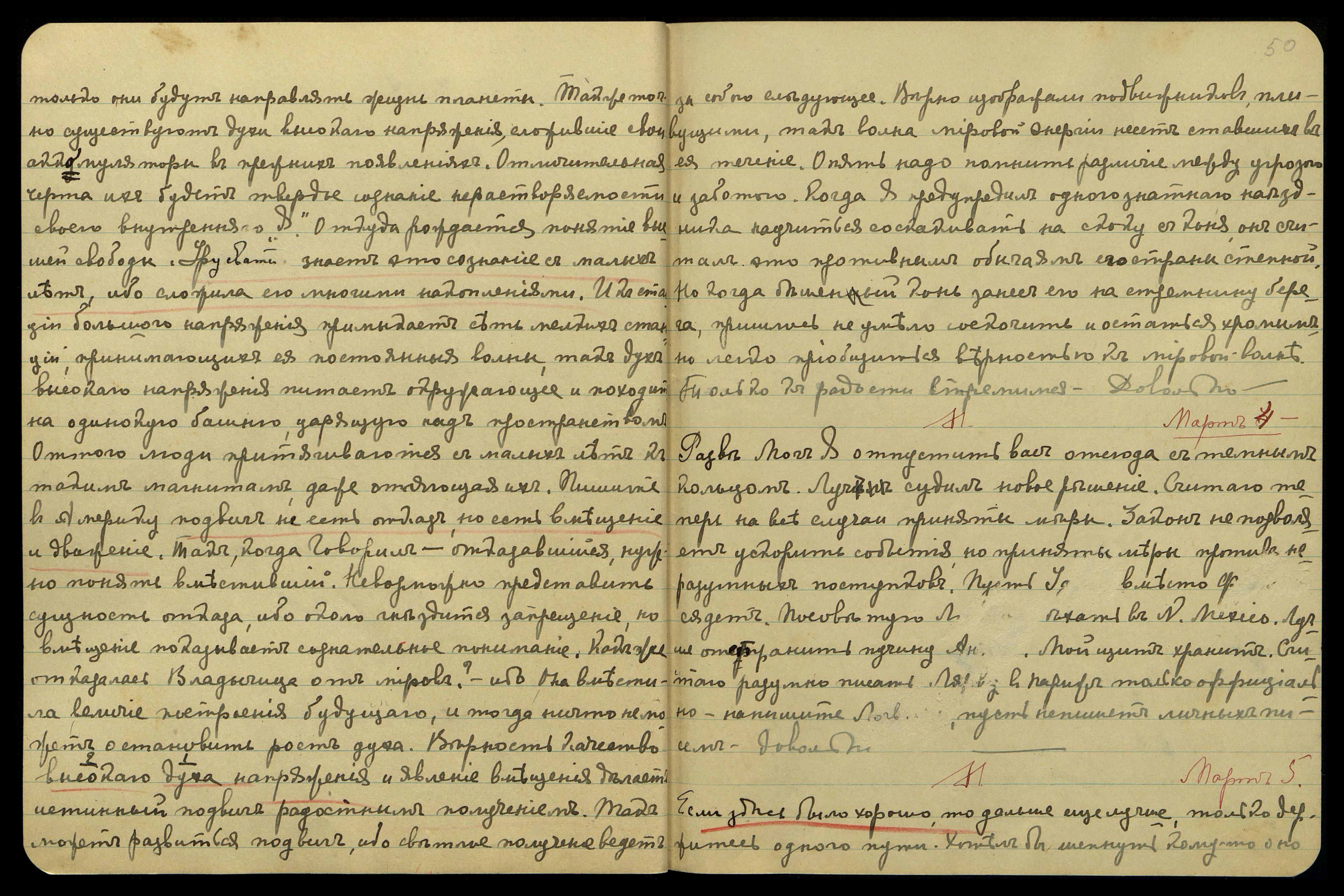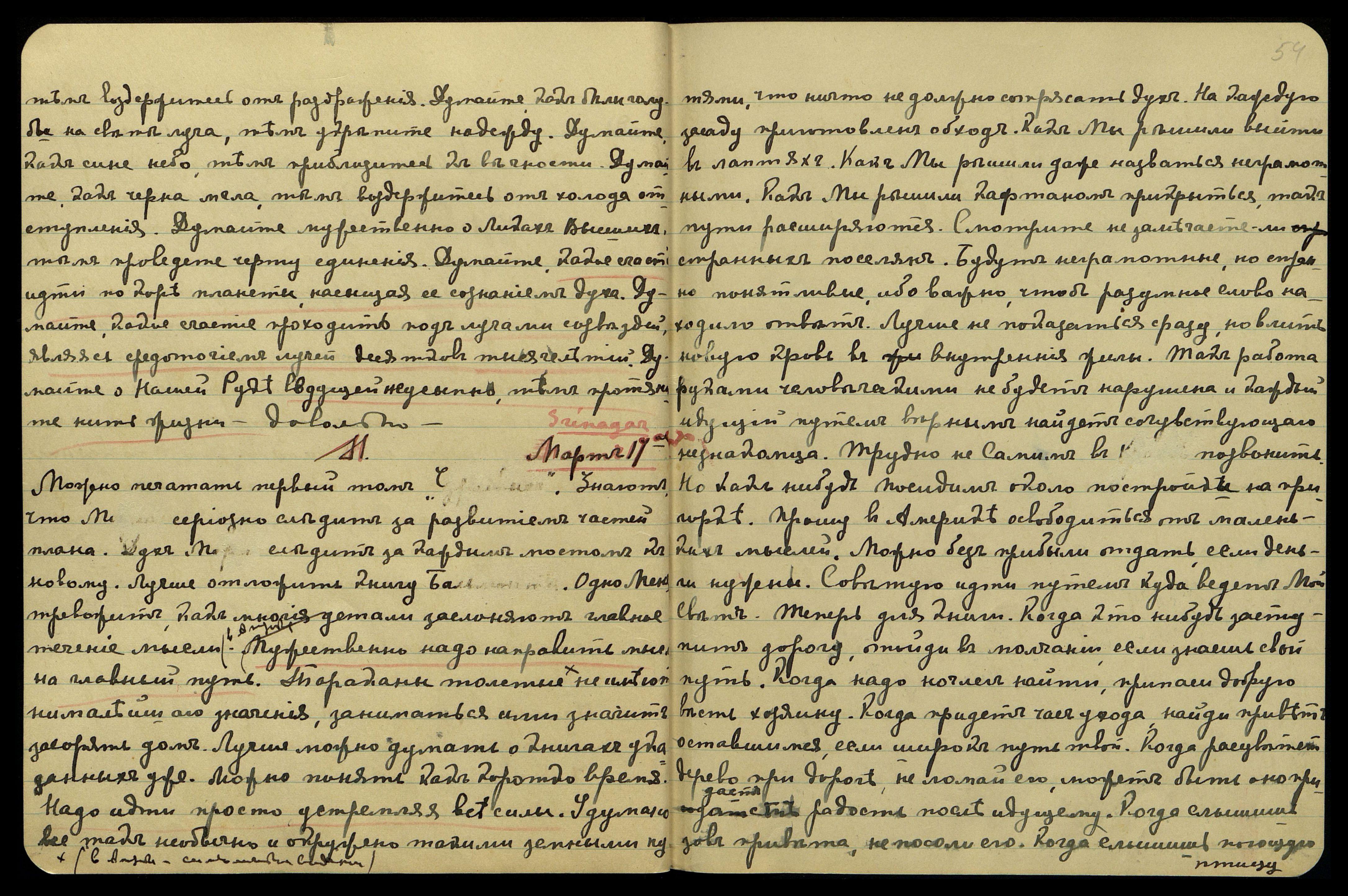 Модры. Удумал, как можно спасти Ярую. Удумал, как найти место даже Чах[ем]Б[уле]. Удумал, как ехать по новым землям. Удумал, как надо удумать, чтобы не разбилась чаша. Лишь прошу, сохранить равновесие от сегодня, ибо Наше зеркало показывает от сегодня — лишь бы не ухудшилось. Лишь бы приняли всё уготовленное им. Не надо портить и можно проявить хоть малую находчивость. Желаю, чтобы книга Удр[аи] была посвящена Урусвати.