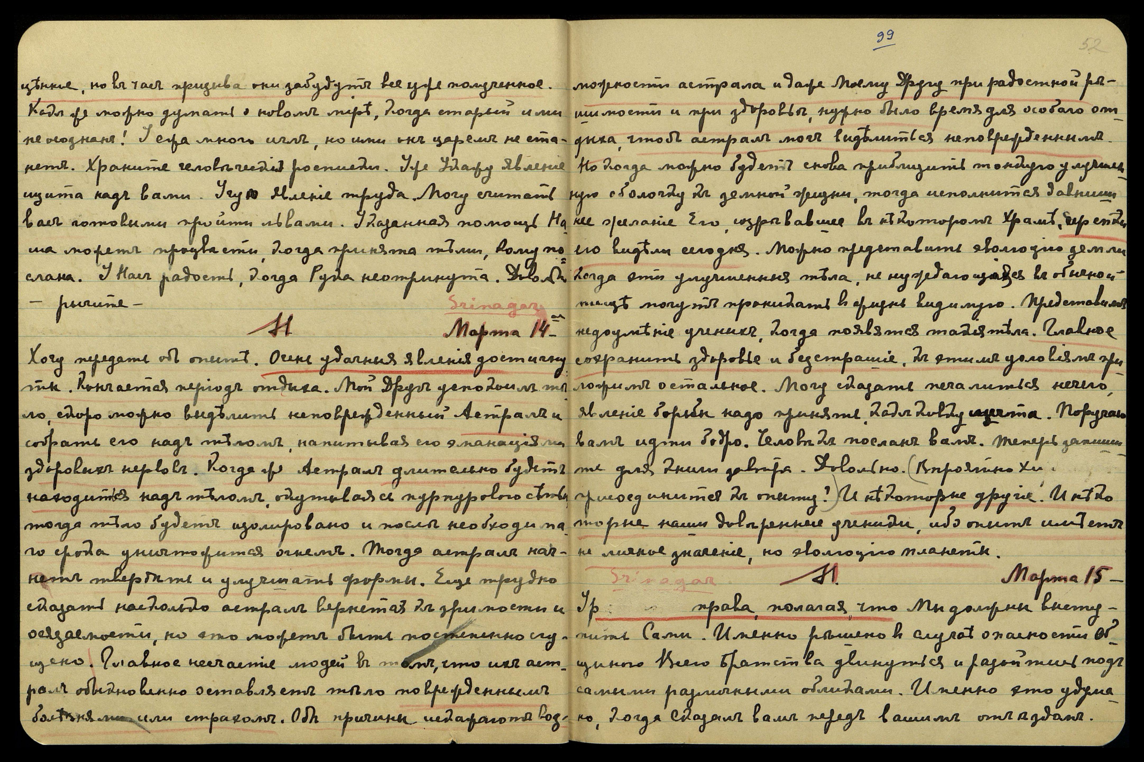 Хочу передать об опыте. Очень удачные явления достигнуты. Кончается период отдыха. Мой Друг успокоил тело, скоро можно выделить неповрежденный Астрал и собрать его над телом, напитывая его эманациями здоровых нервов. Когда же Астрал длительно будет находиться над телом, окутываясь пурпуровою сетью, тогда тело будет изолировано и после необходимого срока уничтожится огнем. Тогда астрал начнёт твердеть и улучшать формы. Ещё трудно сказать, насколько астрал вернётся к зримости и осязаемости, но это может быть постепенно сгущено. Главное несчастье людей в том, что их астрал обыкновенно оставляет тело поврежденным болезнями или страхом. Обе причины искажают возможности астрала, и даже Моему Другу при радостной решимости и при здоровье, нужно было время для особого отдыха, чтоб астрал мог выделиться неповреждённым. Но когда можно будет снова приблизить тонкую улучшенную оболочку к земной жизни, тогда исполнится давнишнее желание Его, созревшее в некотором Храме, черепки его видели сегодня. Можно представить эволюцию земли, когда эти улучшенные тела, не нуждающиеся в обычной пище, могут проникать в жизнь видимую. Представим недоумение учёных, когда появятся такие тела. Главное, сохранить здоровье и бесстрашие, к этим условиям приложим остальное.