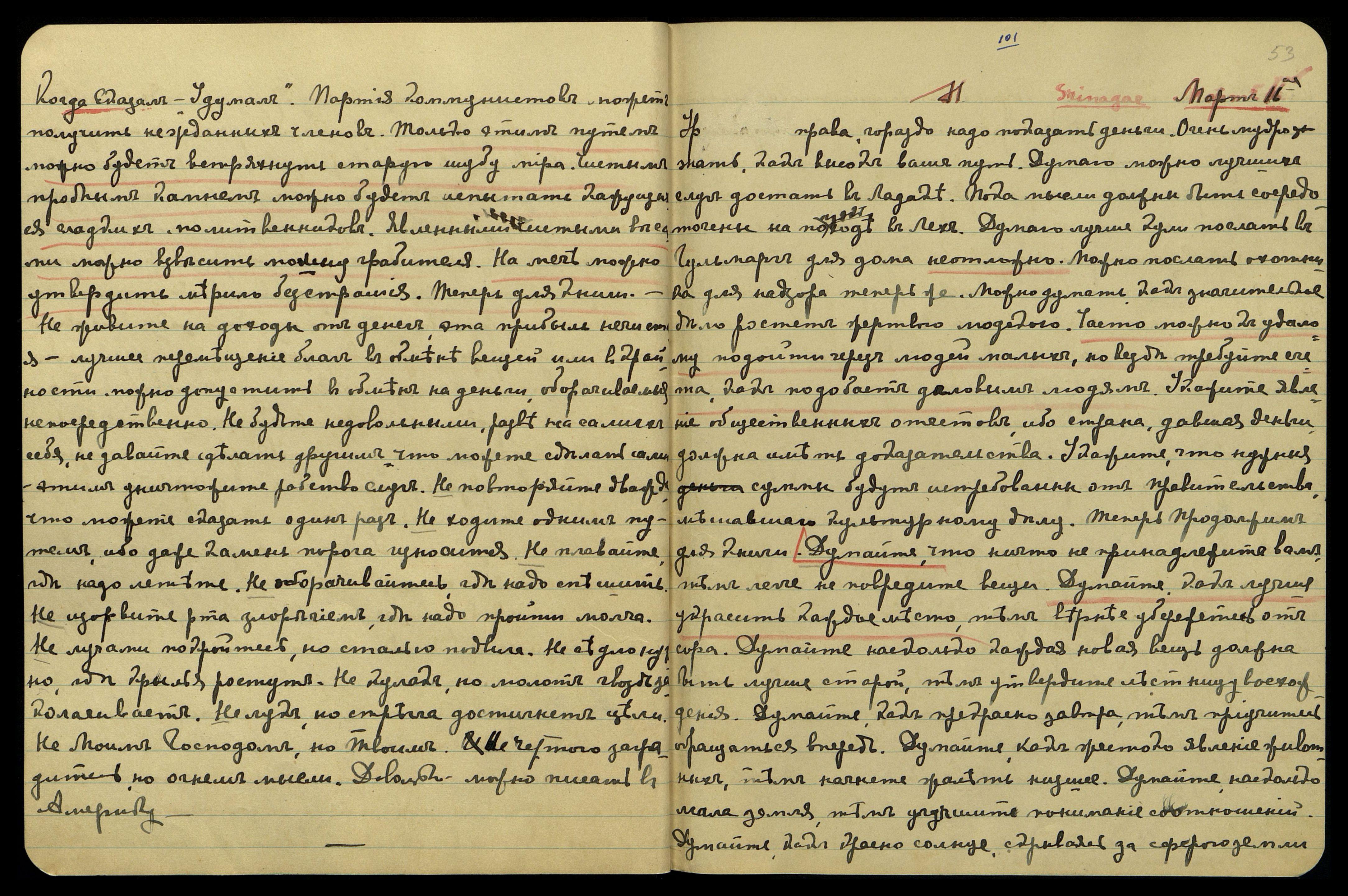 Не живите на доходы от денег, эта прибыль нечистая. Лучшее перемещение благ в обмене вещей или в крайности можно допустить в обмен на деньги, оборачиваемые непосредственно. Не будьте недовольными, разве на самих себя, не давайте сделать другим, что можете сделать сами — этим уничтожите рабство слуг. Не повторяйте дважды, что можете сказать один раз. Не ходите одним путём, ибо даже камень порога износится. Не плавайте, где надо лететь. Не оборачивайтесь, где надо спешить. Не изорвите рта злоречием, где надо пройти молча. Не лучами покройтесь, но сталью подвига. Не седло нужно, где крылья растут. Не кулак, но молот гвоздь заколачивает. Не лук, но стрела достигнет цели. Не Моим Господом, но Твоим. Не чертою заградитесь, но огнём мысли. Довольно. Можно писать в Америку.