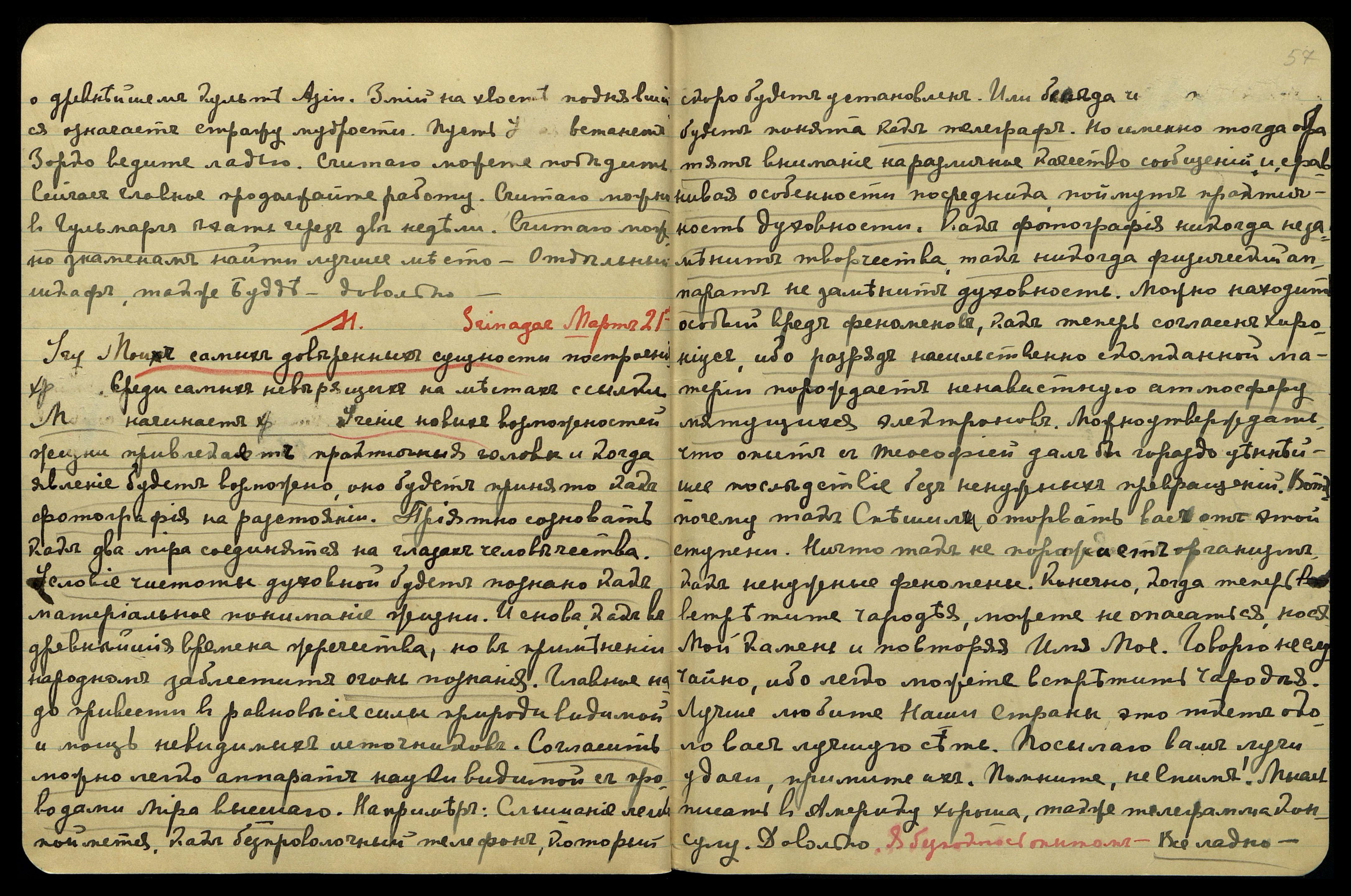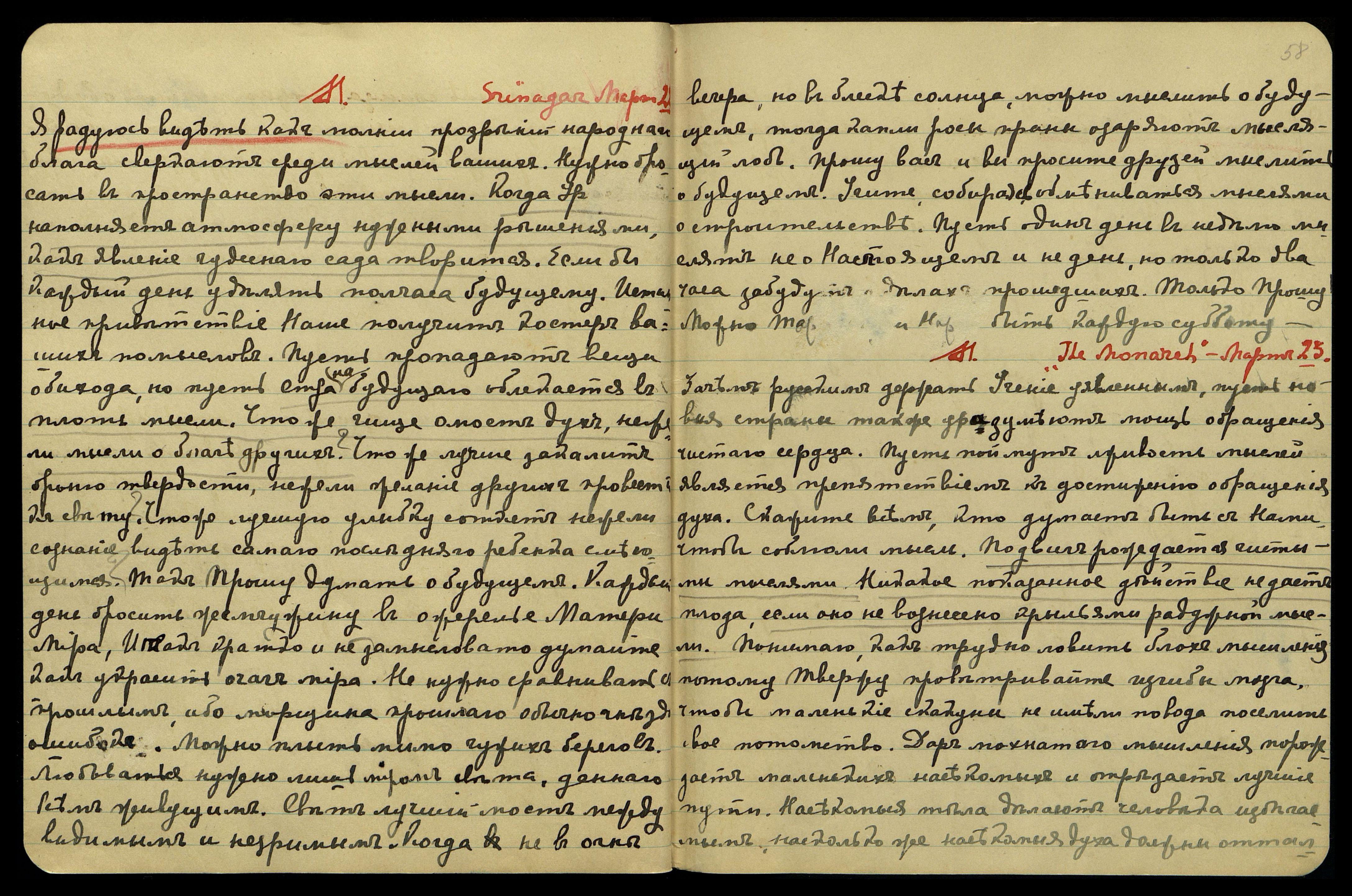 Я радуюсь видеть, как молнии прозрений народного блага сверкают среди мыслей ваших. Нужно бросать в пространство эти мысли. Когда Урусвати наполняет атмосферу нужными решениями, как явление чудесного сада творится. Если бы каждый день уделять полчаса будущему. Истинное приветствие Наше получит костер ваших помыслов. Пусть пропадают вещи обихода, но пусть страна будущего облекается в плоть мысли. Что же чище омоет дух, нежели мысли о благе других? Что же лучше закалит броню твёрдости, нежели желание других провести к свету? Что же лучшую улыбку соткёт,нежели сознание видеть самого последнего ребёнка смеющимся? Так Прошу думать о будущем. Каждый день бросить жемчужину в ожерелье Матери Мира. И так кратко и незамысловато думайте, как украсить очаг мира. Не нужно сравнивать с прошлым, ибо морщина прошлого обычно гнездо ошибок. Можно плыть мимо чужих берегов. Любоваться нужно лишь миром света, данного всем живущим. Свет лучший мост между видимым и незримым. Когда не в огне вечера, но в блеске солнца, можно мыслить о будущем, тогда капли росы праны озаряют мыслящий лоб. Прошу вас, и вы просите друзей мыслить о будущем. Учите, собираясь, обмениваться мыслями о строительстве. Пусть один день в неделю мыслят не о Настоящем и не день, но только два часа забудут о делах прошедших. Только Прошу. Можно Тар[ухану] и Нар[у] быть каждую субботу.