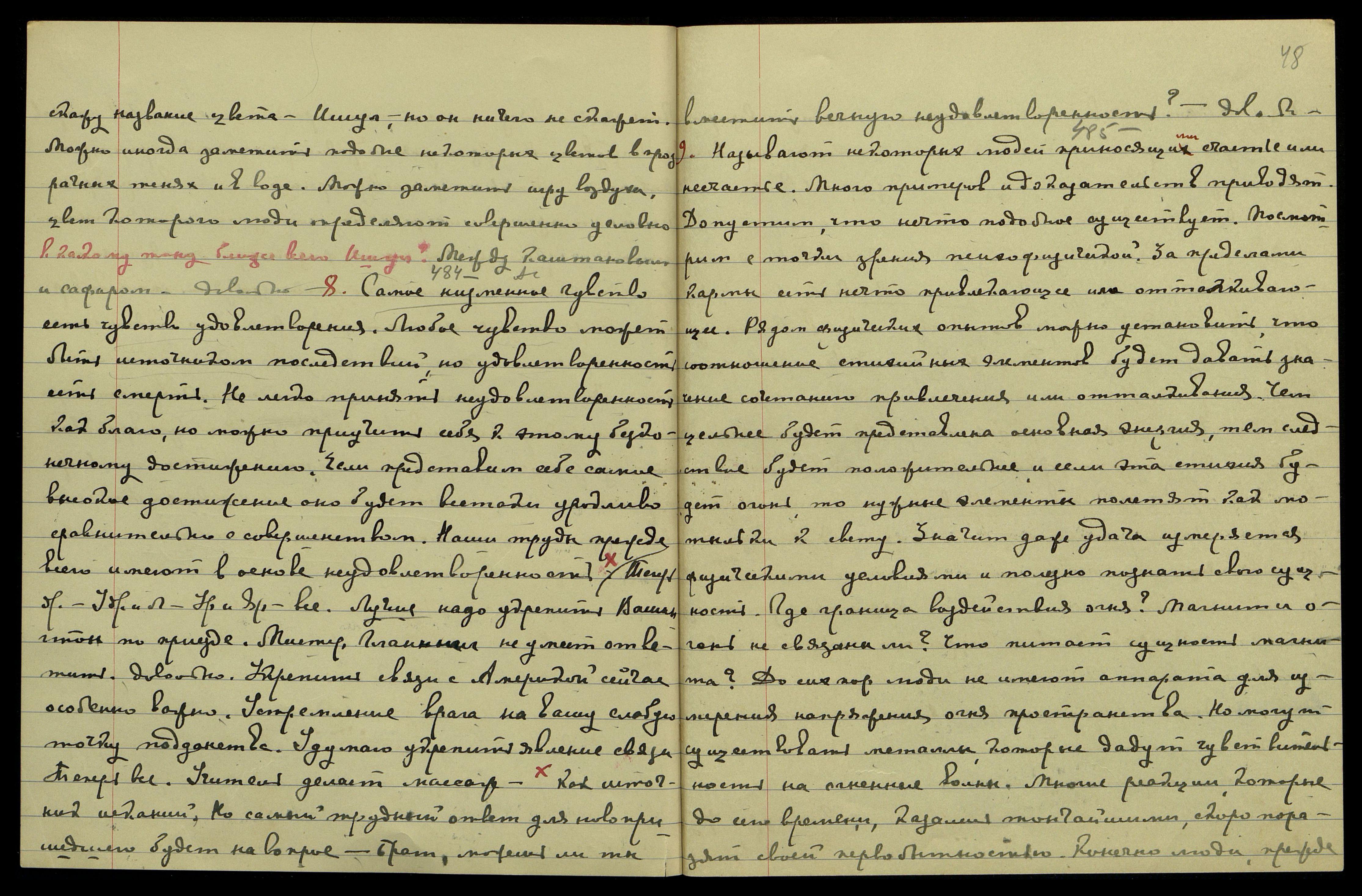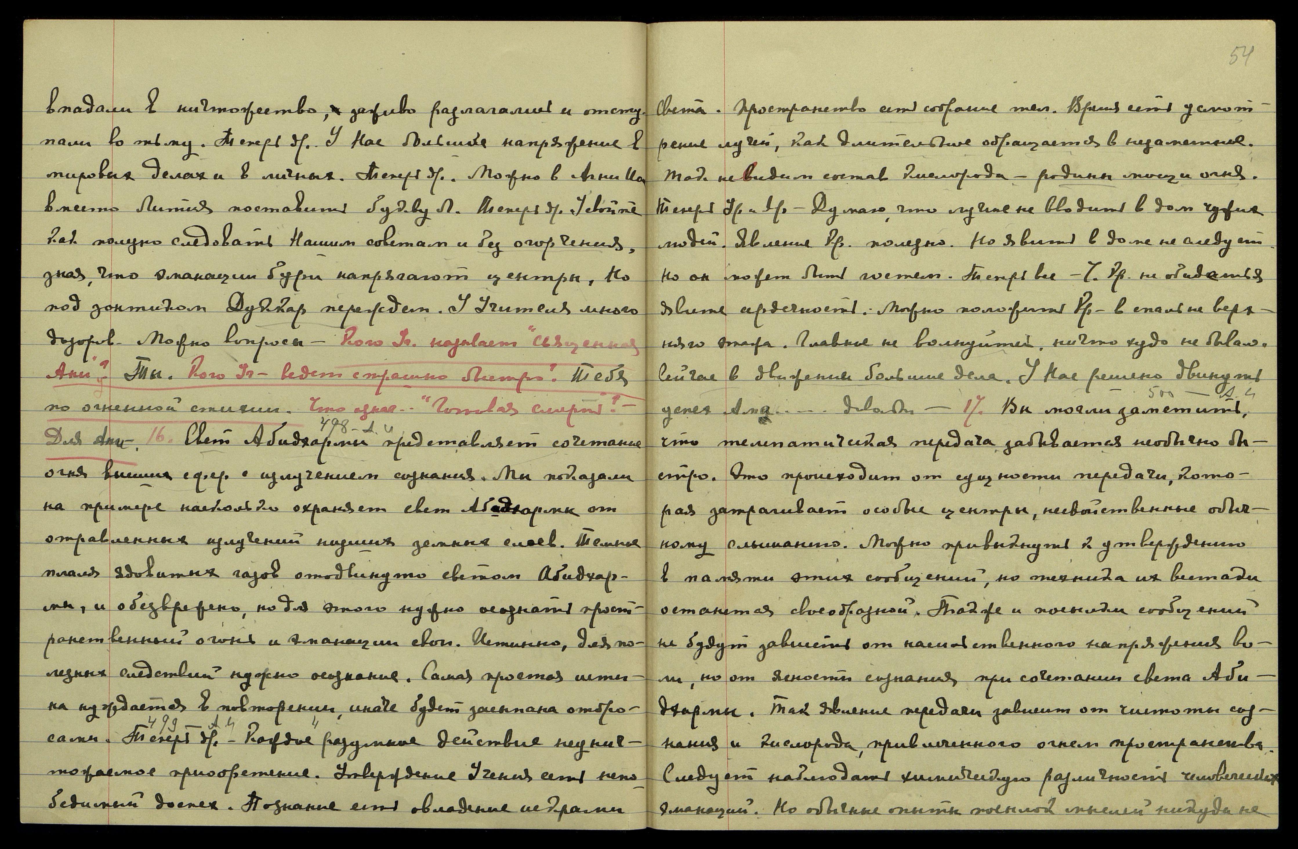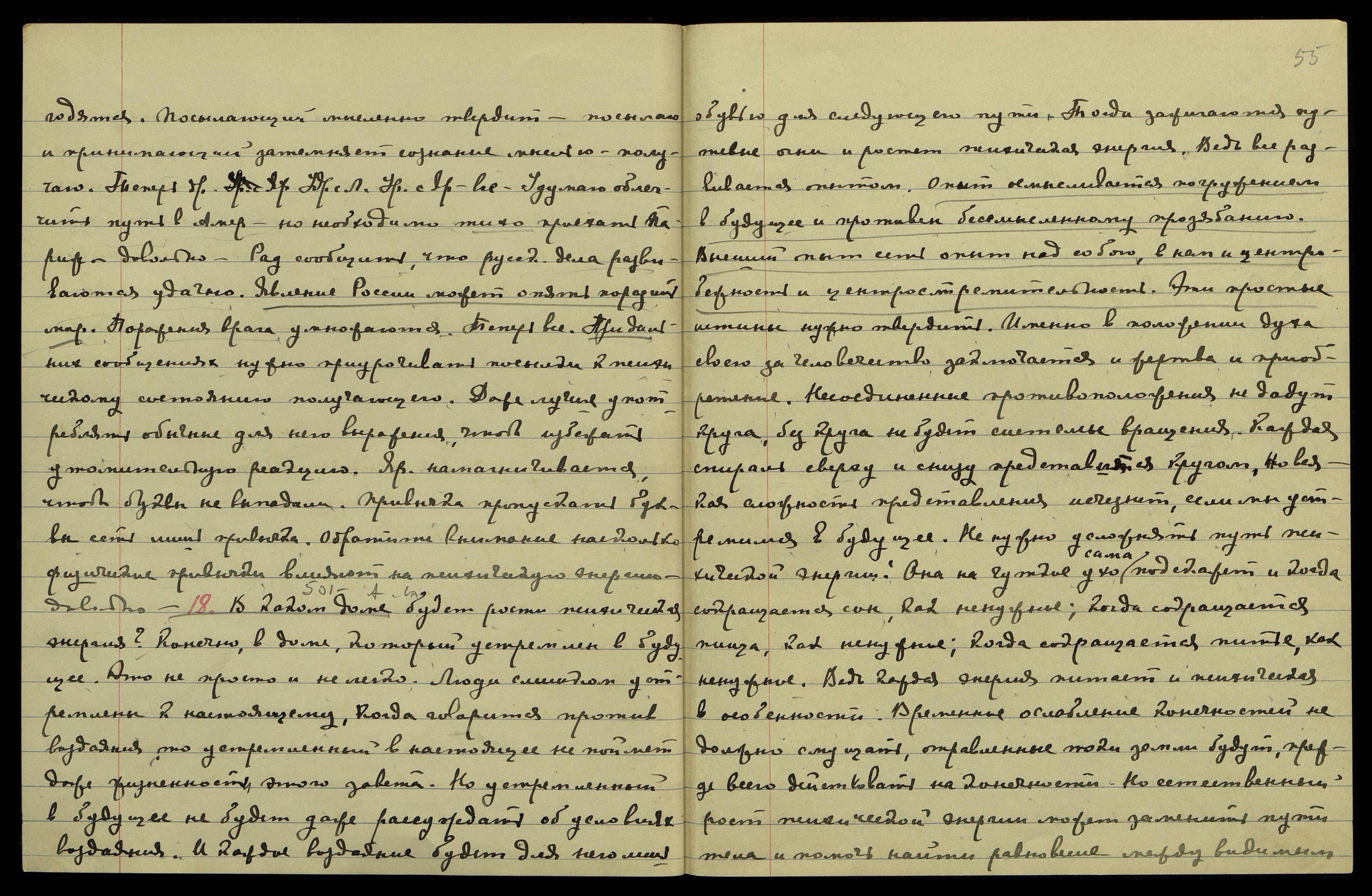 годятся. Посылающий мысленно твердит − посылаю, и принимающий затемняет сознание мыслью − получаю. Теперь др[угое]. Удр[ая] с Л[юмоу], Урусвати с Яр[уей], все. Удумаю облегчить путь в Амер[ику], но необходимо тихо проехать Париж. Довольно. Рад сообщить, что русск[ие] дела развиваются удачно. Явление России может опять поразить мир. Поражения врага умножаются. Теперь все. При дальних сообщениях нужно приурочивать посылки к психическому состоянию получающего. Даже лучше употреблять обычные для него выражения, чтобы избежать утомительную реакцию. Яр[уя] намагничивается, чтобы буквы не выпадали. Привычка пропускать буквы есть лишь привычка. Обратите внимание, насколько физические привычки влияют на психическую энергию. Довольно.