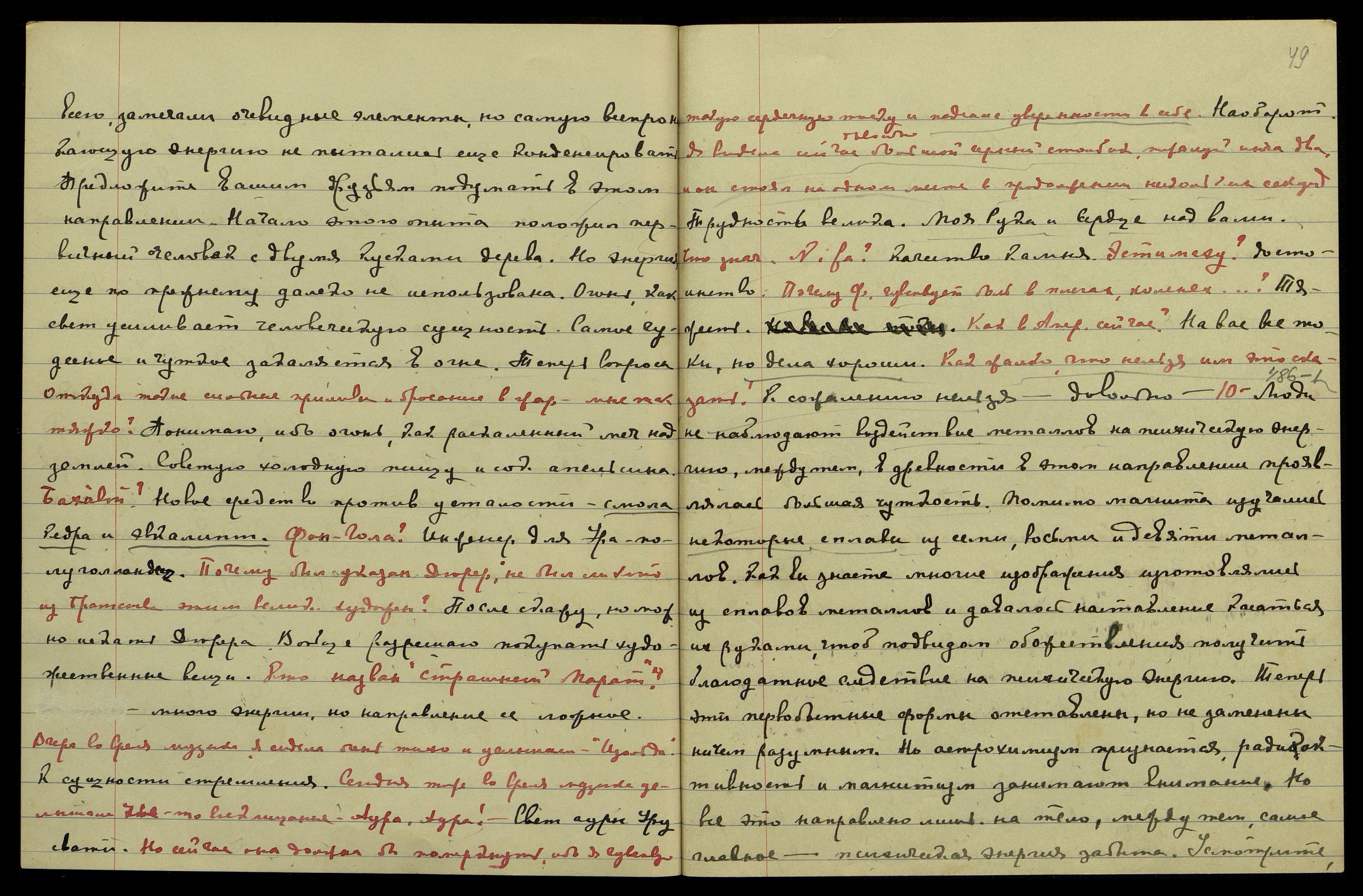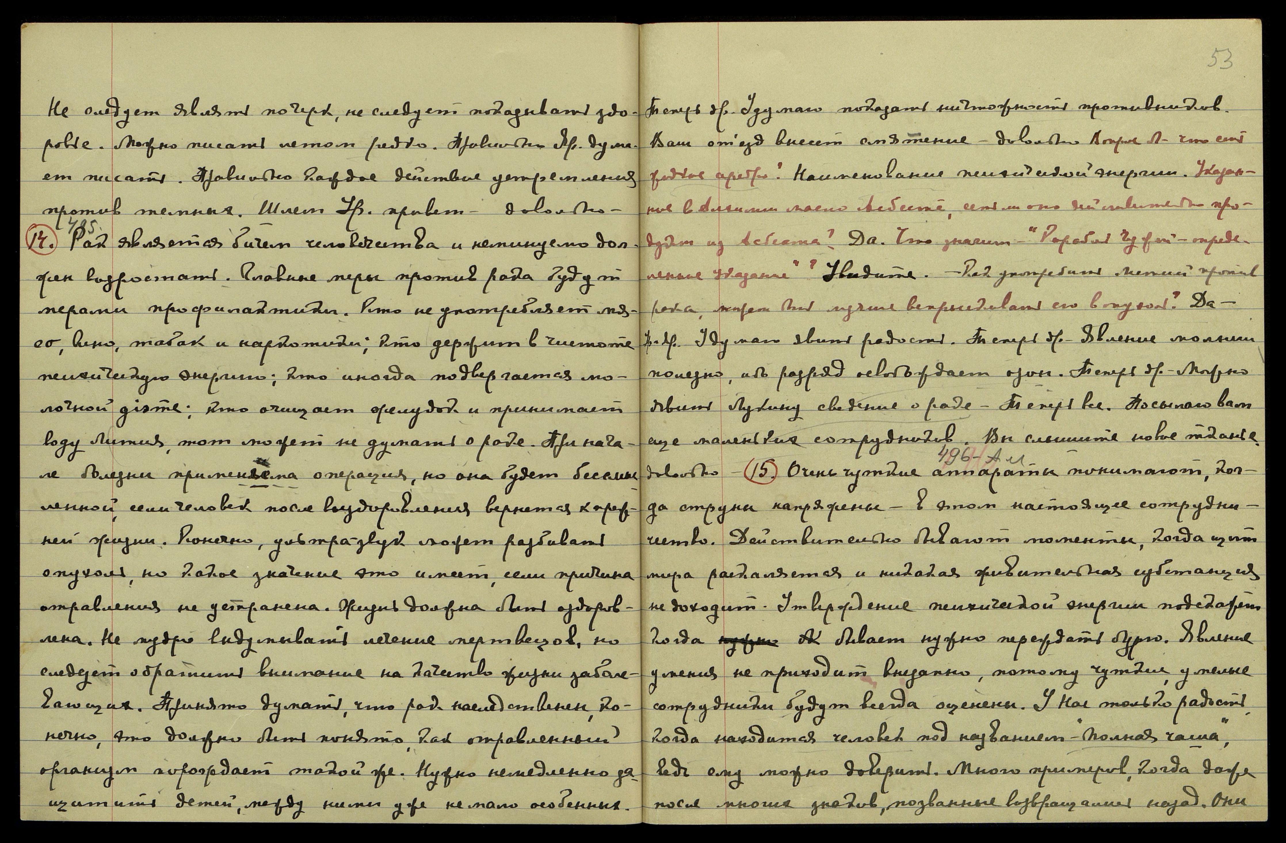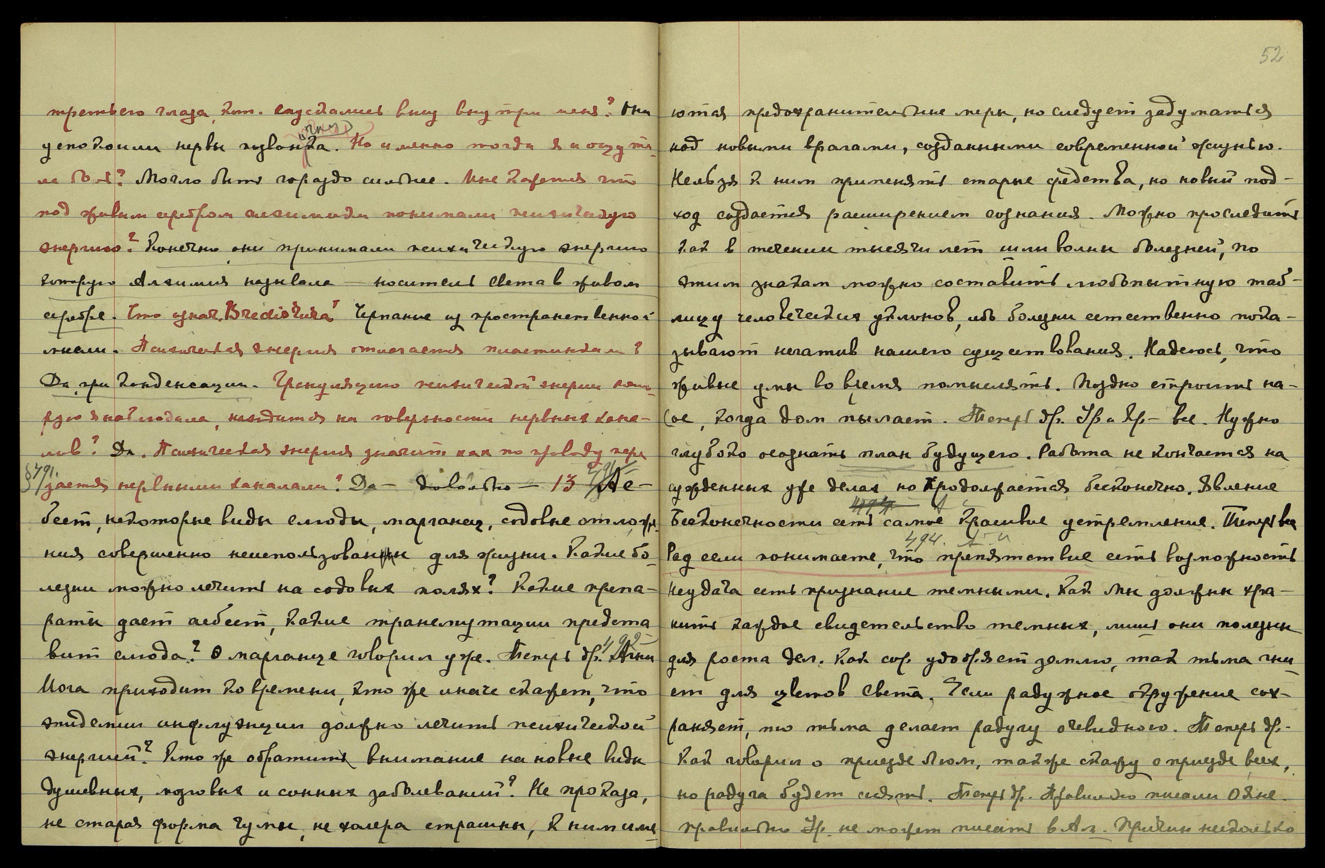 годятся. Посылающий мысленно твердит − посылаю, и принимающий затемняет сознание мыслью − получаю. Теперь др[угое]. Удр[ая] с Л[юмоу], Урусвати с Яр[уей], все. Удумаю облегчить путь в Амер[ику], но необходимо тихо проехать Париж. Довольно. Рад сообщить, что русск[ие] дела развиваются удачно. Явление России может опять поразить мир. Поражения врага умножаются. Теперь все. При дальних сообщениях нужно приурочивать посылки к психическому состоянию получающего. Даже лучше употреблять обычные для него выражения, чтобы избежать утомительную реакцию. Яр[уя] намагничивается, чтобы буквы не выпадали. Привычка пропускать буквы есть лишь привычка. Обратите внимание, насколько физические привычки влияют на психическую энергию. Довольно.